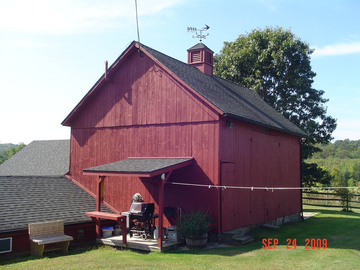 This is a 1 ½ story, eave-entry bank barn with three additions. The barn has a rectangular footprint and a pitched roof with a ridge-line running east-west, which is perpendicular to Colonel Ledyard Highway. The main eave faces north and has a pair of double-height swinging hinged doors, which are centrally located and a pass-through door at the east corner. Mortared fieldstone foundtion is exposed. The east gable-end of the barn has a shed-roof porch addition, which is located off center to the north. Connected to the southeast corner is a gable-roof addition, which extends to the east and its ridgeline runs east-west. The south eave-side has a second gable-roof addition, which extends to the south and its ridgeline runs north-south. The west gable-end has a projecting hay hood and a hinged hay door, which is located toward the top of the gable. The rest of the west gable-end appears to be blank. The barn is clad in vertical siding on the north, east, and west sides and wood shingles on the south side, which have been painted red. The roof has a projecting overhang and is covered in asphalt shingles. In the center of the ridgeline is a cupola with a weathervane.