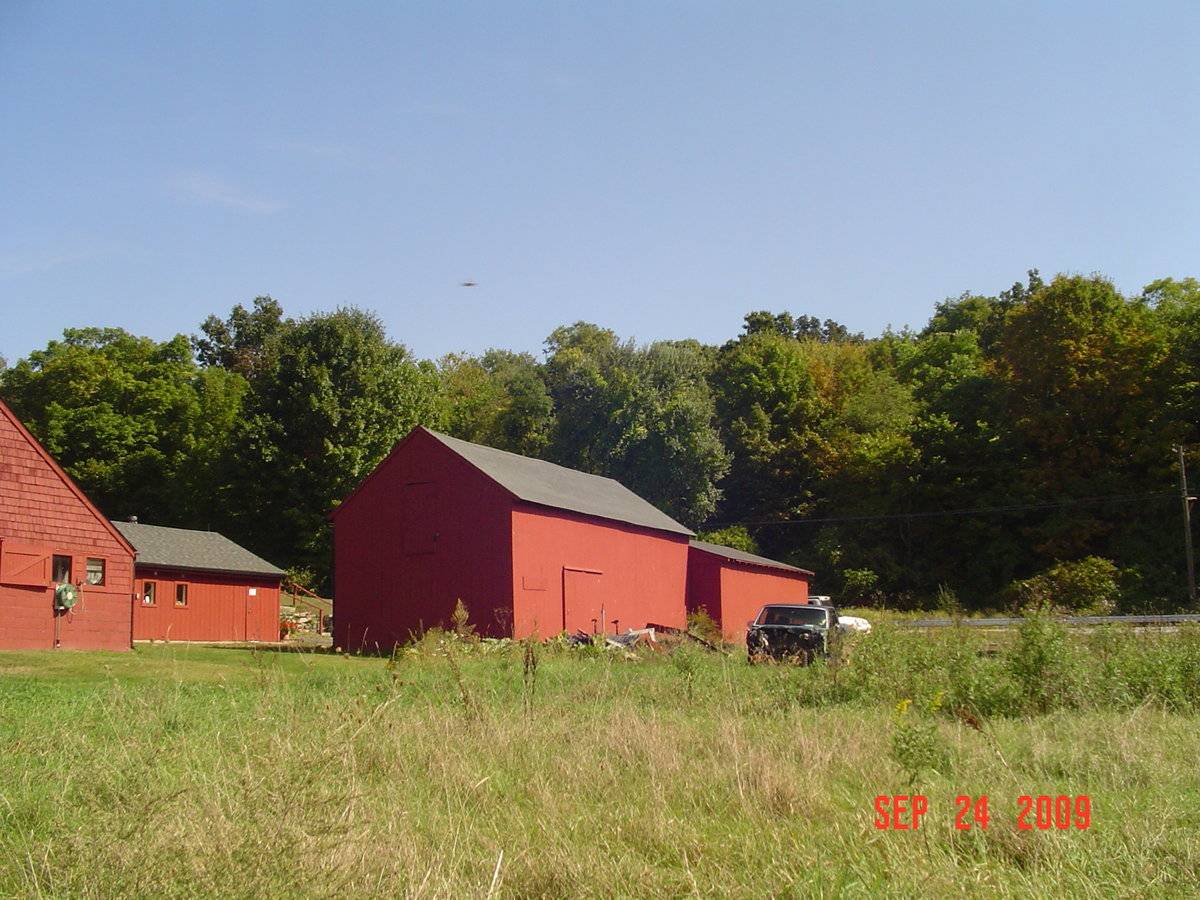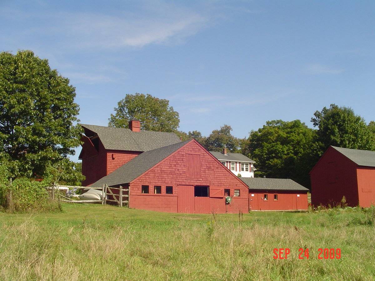 The total area of the site is 18.63 acres, which includes a house, four barns, wagon shed, shed, in-ground pool, and a stone wall. The house faces south and is located to the northeast of the barn. The ridgeline of the house runs east-west, as does the ridgeline of the barn. The in-ground pool is located to the west of the house and the smaller shed is located to the southwest of the house. Connected onto the south eave of the barn are two barns, one of which extends to the south and the other extends to the east. Southeast of the three connected barns is a barn and wagon shed, which are connected. A stone wall is built into a bank on the north side of the driveway. The land is being used for active agriculture and woodlands are found primarily to the west of the property.