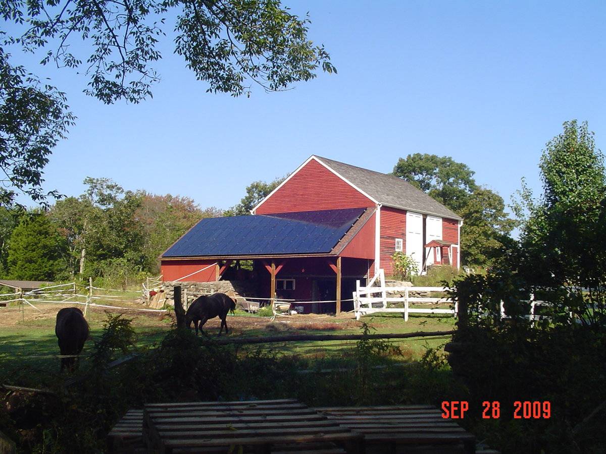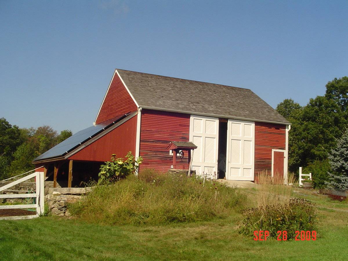 Property listed on National Register of Historic Places. This bank barn originally used as a dairy barn and for hay storage. Owner thinks barn may be from 1830. Barn has had some restoration work. Present use is for horses and roof holds solar panels. Barn seems to have had some use connected with a portable sawmill sometime in the not too distant past. Smaller building with a cupola is a newer building but also in keeping with uses of this present day farmstead.