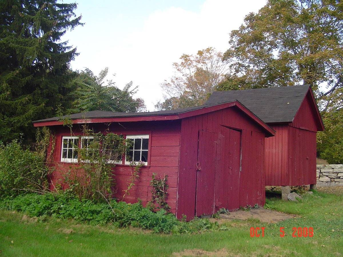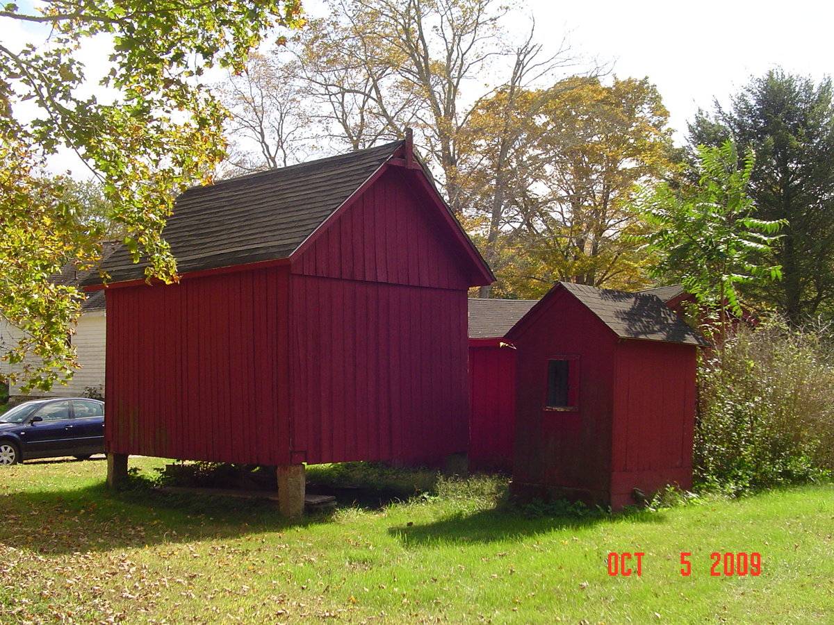 Building A is a one-story gable-roofed structure with its ridge line oriented east-west, raised above grade on stone posts, probably a corn crib. It has vertical walls (atypical for a corn crib) with vertical board siding painted red, and asphalt shingle roof.