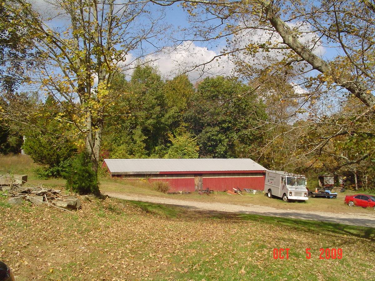Collection of 5 farm buildings; outhouse, corn crib, shed with 2 wooden plank doors on gable end, shed built into small bank, and metal building. Contemporary metal building a goodly distance from the rather historic collection of wooden buildings. No sign of farm activity at present. Note: Shed built into bank with one interesting stonework side, see photo.