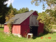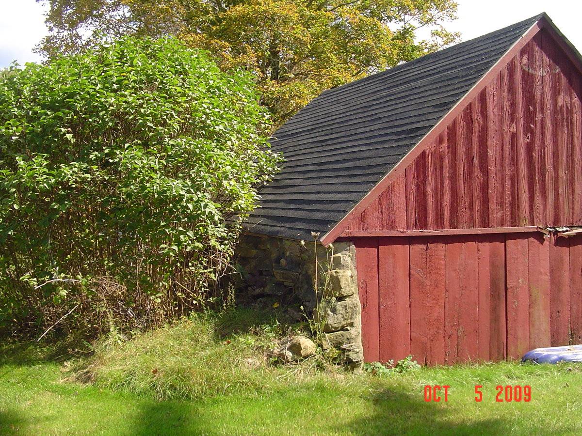Buildng D. is a one-story gable-roofed structure with its ridge line oriented east-west and eaves less than 6 feet above grade, located to the northwest of Buildlngs A and B. It has a mortared fieldstone foundation on the west, south, and east sides, and a full-height fieldstone wall on the north. Siding is vertical boards painted red. There is a door opening in the east gable-end and a door into the loft level above. This appears possibly to have been a storage building such as a root cellar or spring house.