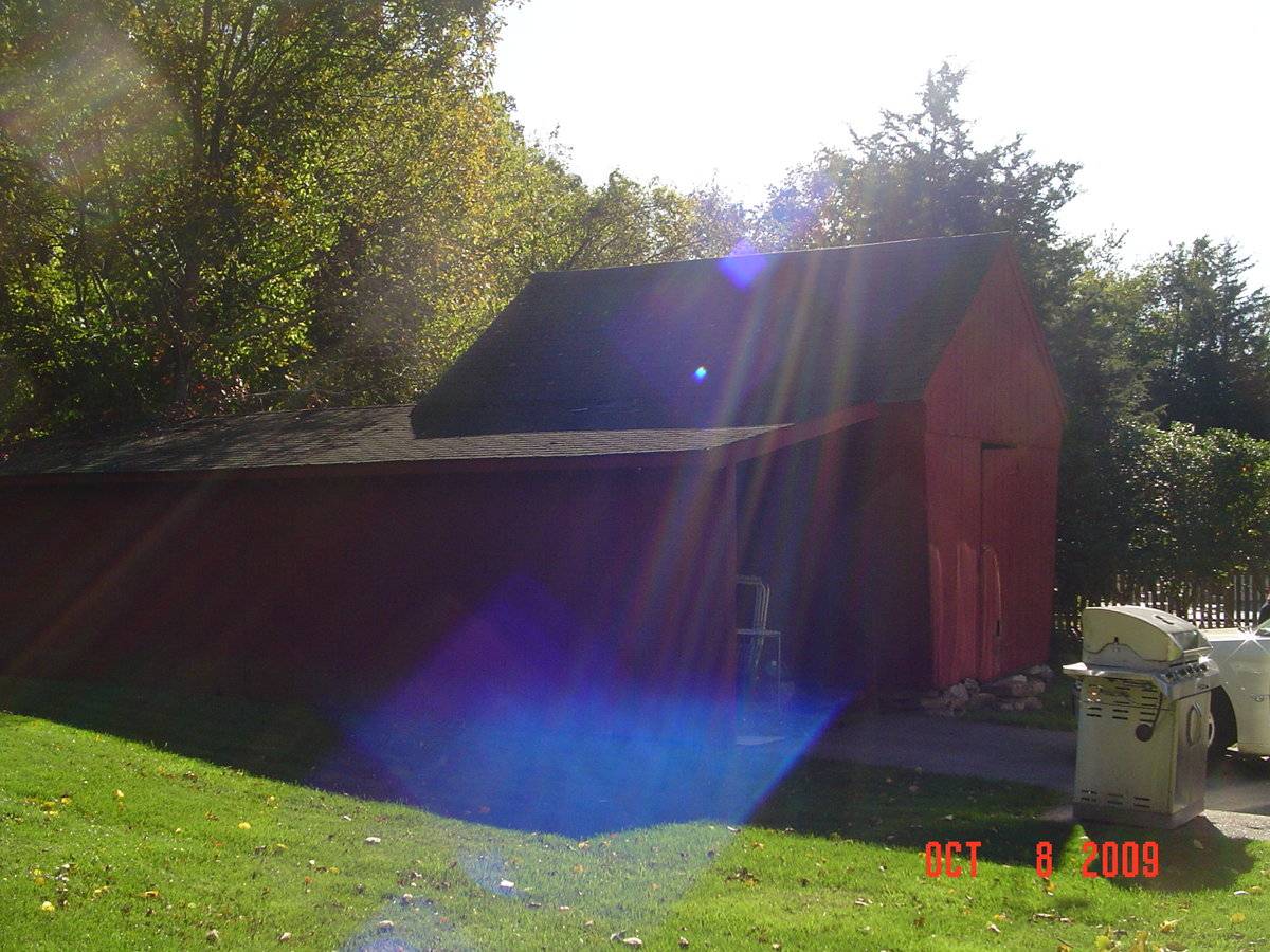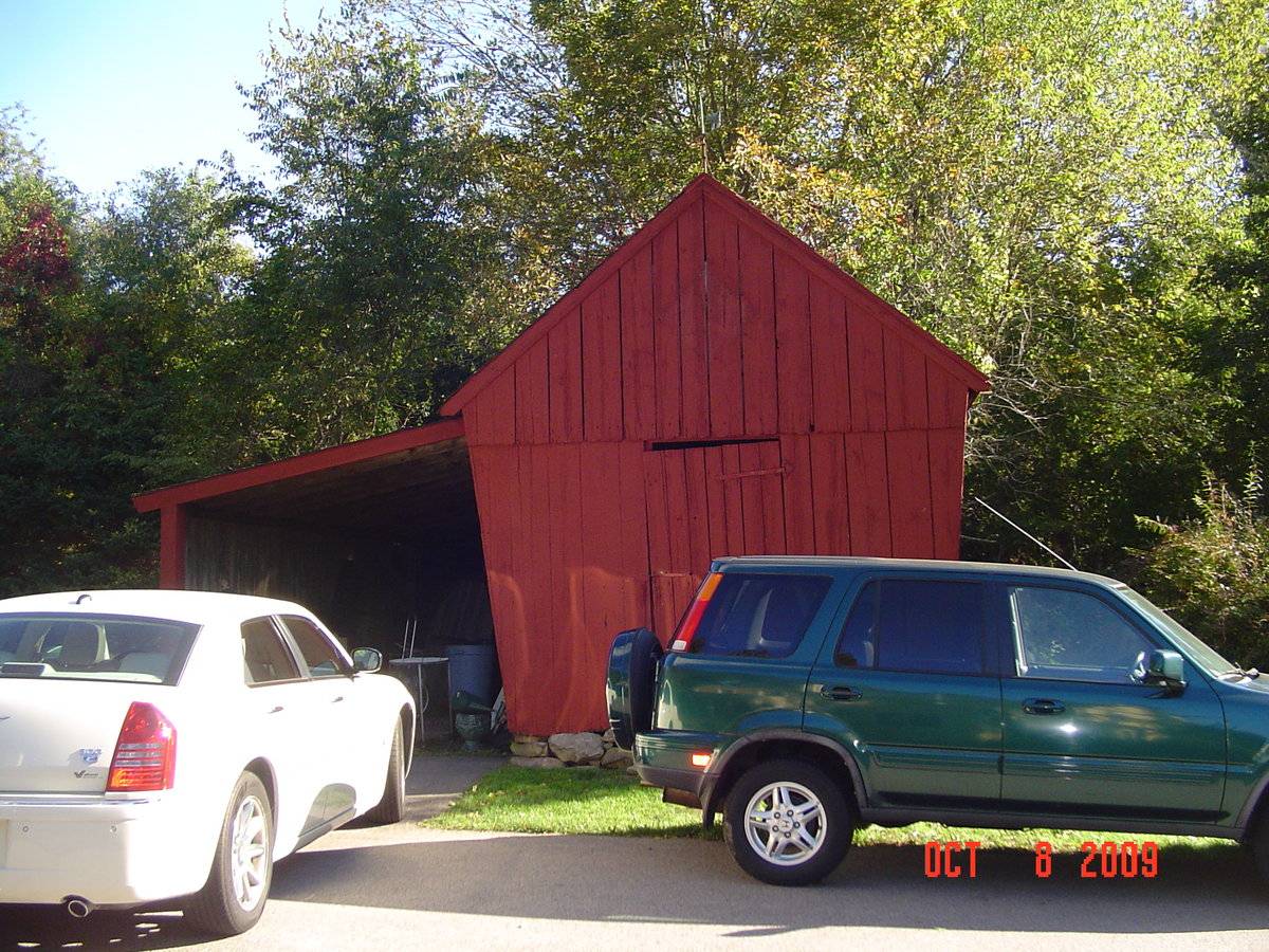 This is a 1 story gable-entry corn crib. The corn crib has a rectangular footprint and a pitched roof with a ridge-line running east-west, perpendicular to Long Cove Road. The corn crib has slanted side walls on the eave sides. The main gable-end faces west and has a pass-through door, which is centrally located. Connected onto the north eave side is a carport with a shed roof which extends from the eave of the corn crib. The carport extends to the east covering the entire north eave side of the corn crib. Connected onto the east gable-end is a shed. The north eave side has two fixed six pane windows, which are located toward the center. The corn crib is set above the ground on flagstone and is clad in vertical siding, which has been painted red. The roof has overhanging eaves and is covered in asphalt shingles.