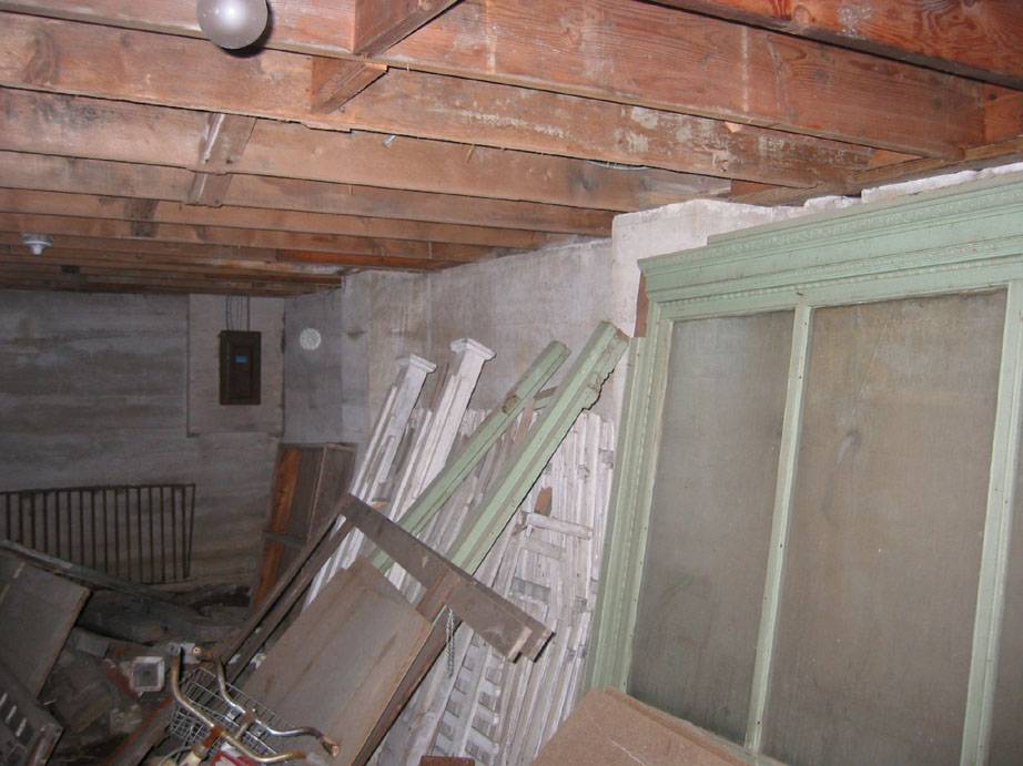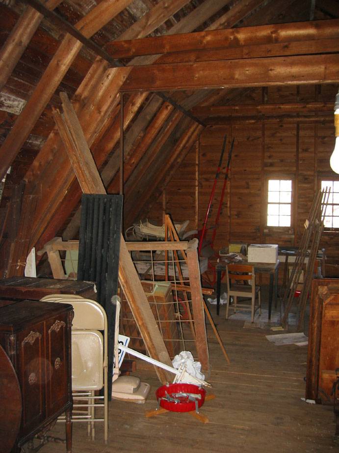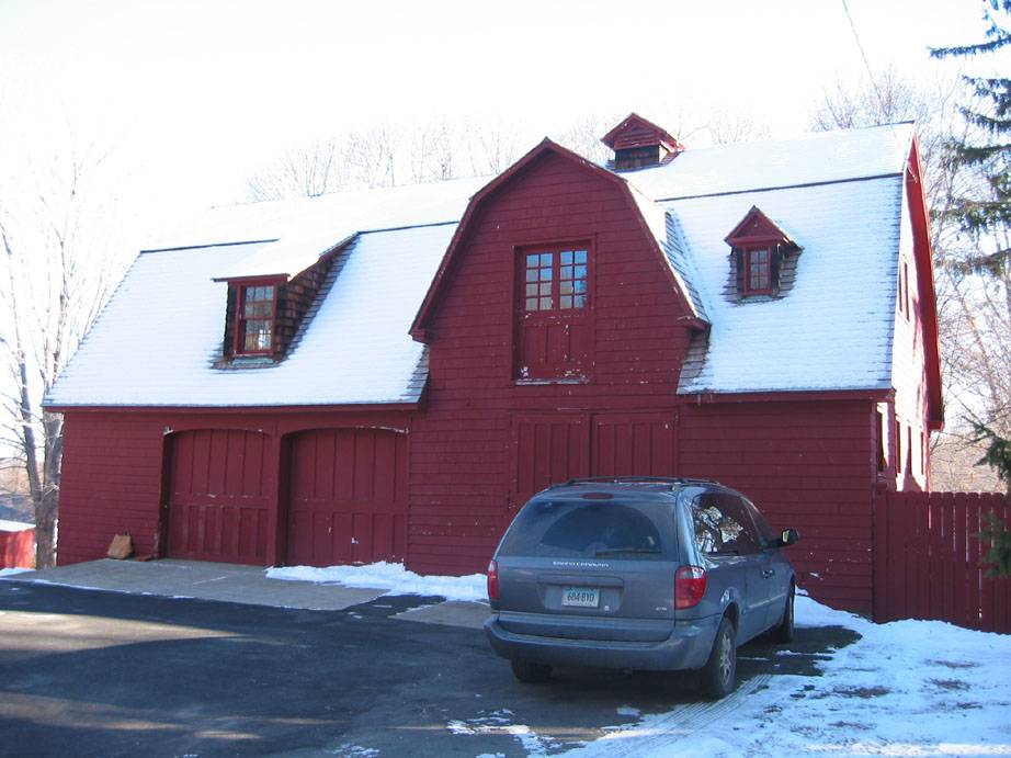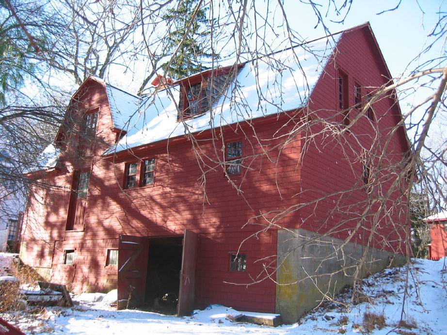 This is a 2 story side or eave-entry carriage house bank barn with a gambrel-roofed cross-gable. The main facade faces west towards Main Street, which runs approximately north-south. The main entry is a pair of swinging hinged doors located off center of the gambrel cross-gable towards the south end of the facade. Centered in the gambrel cross-gable on the second level is a pair of interior sliding haydoors, each with eight lites. To the south on the second level is a small gable-dormer with a six-pane window. In the north end of the facade are two overhead garage doors at main grade. Above on the second level is a shed-dormer with a six-over-six double hung window. The north gable-facade has a six-over-six double hung window at main grade in the center of the facade and two six-over-six double hung windows next to an inexplicable pass-through door on the second level. The east eave-facade has a pair of swinging hinged doors below grade next to three fixed six-pane windows. The main level has three six-over-six double hung windows and a haydoor identical to that on the opposite facade (a pair of interior sliding haydoors, each with eight lites). Beneath the apex of the roof of the gambrel-roofed cross-gable is yet another identical pair of haydoors. The structure has a concrete masonry foundation. The exterior sheathing is wood shingles painted red. The roof has unpainted wood shingles with a cupola in the center. The sides of the dormers also have unpainted wood shingles.