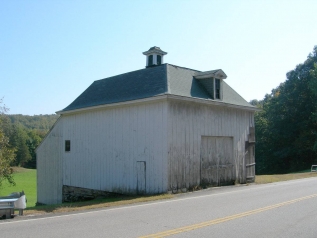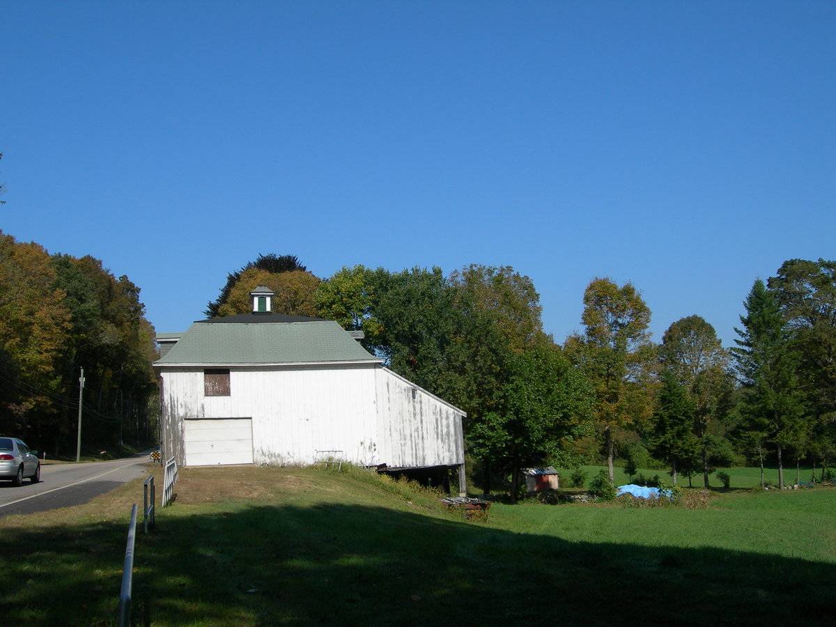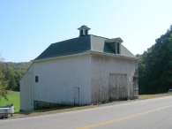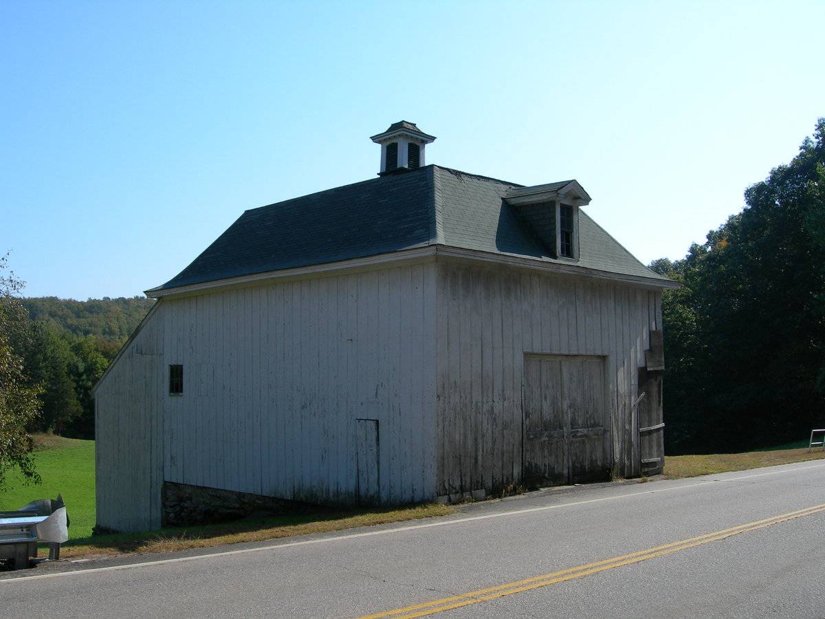 This is a 1 ½ story three-bay, side- or eave-entry bank barn with a mansard roof and shed-roofed addition. The barn’s main facade faces Route 32 . The ridge line runs parallel to the street. The main entrance of the barn is a pair of interior sliding doors in the center bay. The right bay of the main facade has a pass-through door. Centered above the eave is a gable-roofed dormer with a six-over-six double hung window. The left facade has a pass-through door in the right corner and in the left corner is a fixed six-pane window. The rear facade has a shed-roofed addition which appears to have a series of open bays on the basement level. Above the eave of the mansard roof is a gable-roofed dormer with a six-over-six double hung window. The right facade has an overhead door in the left corner. There appears to have been a haymow door centered above the overhead door that is now boarded up. The barn has vertical siding that is painted white and a mortared fieldstone foundation. The roof is straight with a flare and has asphalt shingles and a concave mansard-roofed cupola with dentils.