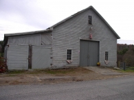The grade at the west, eave-side of the barn inclines sharply to the main level. The right (south) half of the west eave-side of the barn has two, six-pane stable windows and a pass-through door is located in the left (north) half. The barn has clapboard siding and corner boards, painted gray. The foundation is fieldstone and the west slope of the roof has asphalt shingles, while the east slope has roll roofing. The addition is sheathed in vertical siding. The roof on the addition is roll roofing.
