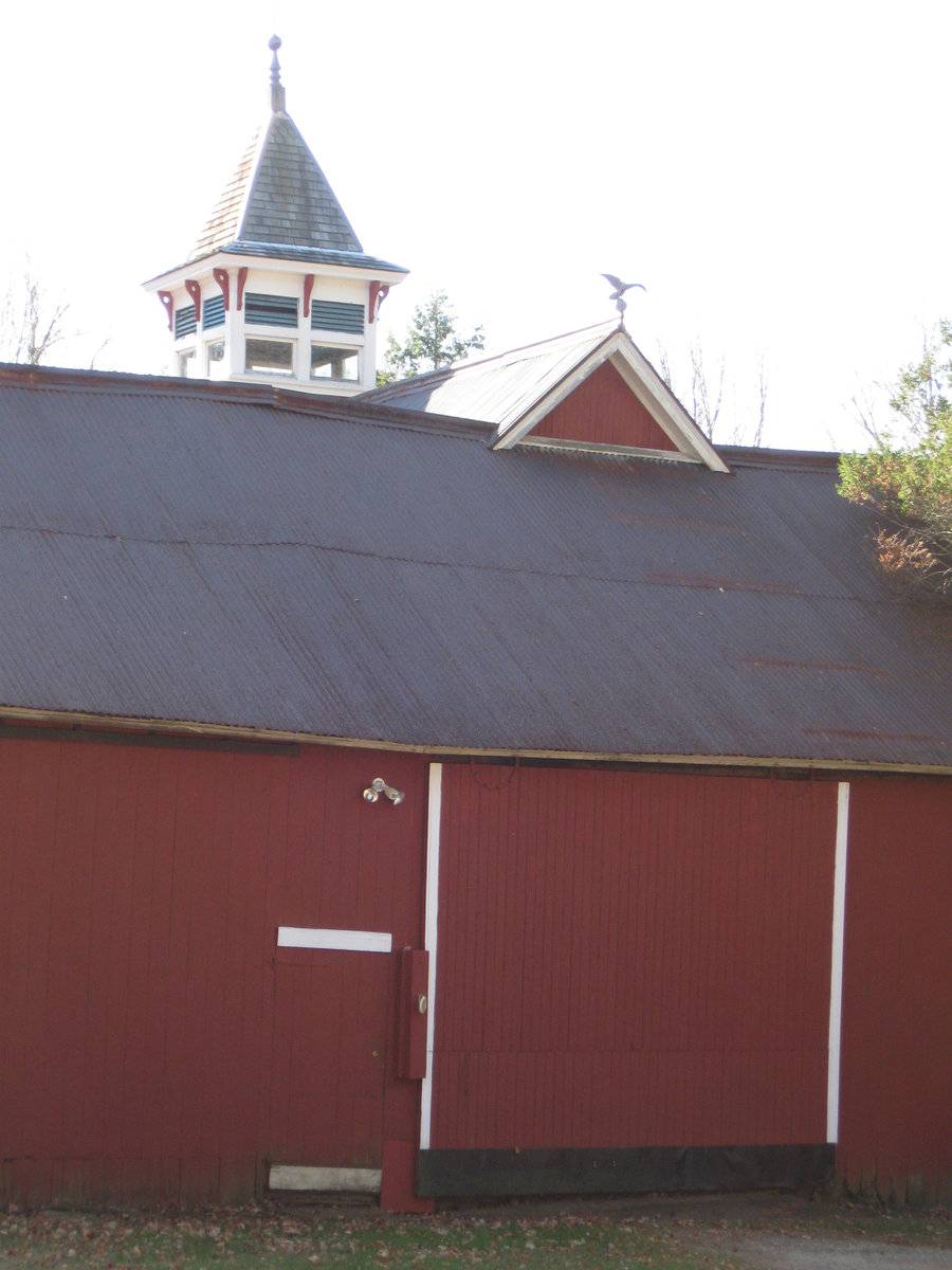 The large barn consists of a simple English barn with its long side and two sliding doors facing north to High Street, and a wing perpendicular extending south. This structure is a bank barn, as the grade slopes down toward the south. Its roof line is taller than the English barn structure, so that a gable end of the ridge is visible from High Street projecting above the ridge. The south wing also has the ornate cupola, suggesting a later date for this addition.