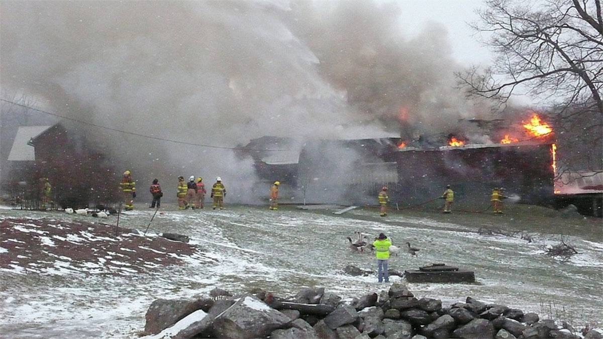 Barns at the Scoville farm, one of the oldest in Cornwall, have been destroyed by an early morning fire on Thursday Picture by Martha Loutfi http://www.registercitizen.com/articles/2010/01/01/news/doc4b3d45b3e9150882672530.txt News story: Waterbury Republican-American Friday, January 1, 2010 3:15 AM EST Scoville barn destroyed by huge fire in Cornwall BY JIM MOORE REPUBLICAN-AMERICAN Firefighters battled a barn fire on the Scoville family farm in Cornwall for hours Thursday, with flames still licking the remains of the barn more than six hours after the fire broke out. Jim Moore Republican-American. CORNWALL — A spectacular fire reduced a Scoville family barn to embers Thursday morning. The barn dated to the 1700s, as old as the town itself. The devastated dairy house, about 30 feet by 60 feet at its foundation, was last used for milking in 2006, when the Scovilles decided to abandon the struggling milk business as their farm's main endeavor. An electrical malfunction is suspected, although fire officials said the damage was so severe the precise cause never will be known. Fire engines and trucks lined Town Street at the intersection with Scoville Road, a crossroads in both local and family history: The Cornwall Historical Society lists Samuel, Stephen and Timothy Scoville as immigrants from Saybrook who took over the farm in the 19th century. The barn predated the Scoville family's ownership of the farm, its origins closer to the town's founding in 1738."They've been here since Cornwall was Cornwall," Fire Chief Earle Tyler said of the Scovilles. Tyler led an effort that lasted through the day to contain flames fueled by 10,000 bales of hay. Firefighters broke through a foot of ice to draw water from nearby ponds and shuttled more water in tankers. Foam was spread to smother smoldering hay. The milk barn, featured in a historical society calendar for its history and vision of the rural Litchfield Hills, was reduced to a smoking pile of charred rubble. But two adjacent barns about 20 feet from the lost structure were saved. The silo, right next to the lost building, still stood under clearing afternoon skies. No injuries were reported, and family and friends got all the cows and pigs out of the barn unharmed. "It was a good stop," said Deputy Fire Marshal Michael G. Fitting, who was unable to estimate the dollar value of the loss, or determine the exact point of origin.