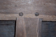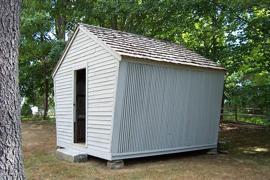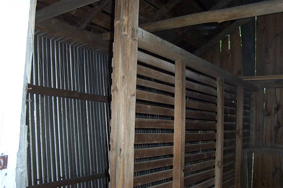 In the middle of the 19th century, growing “Indian” corn became popular. Storing the corn on the cob in well-ventilated corn cribs allowed the kernels to dry without spoiling. The distinctively shaped corn crib, with slanted side walls built of spaced wooden slats, became common by the 1860s. The overhanging eaves and slanted walls helped prevent rain from splashing inside. Vertical side walls are also common. Corn cribs are typically set high above the ground on wooden or stone posts.