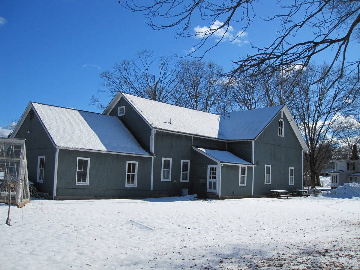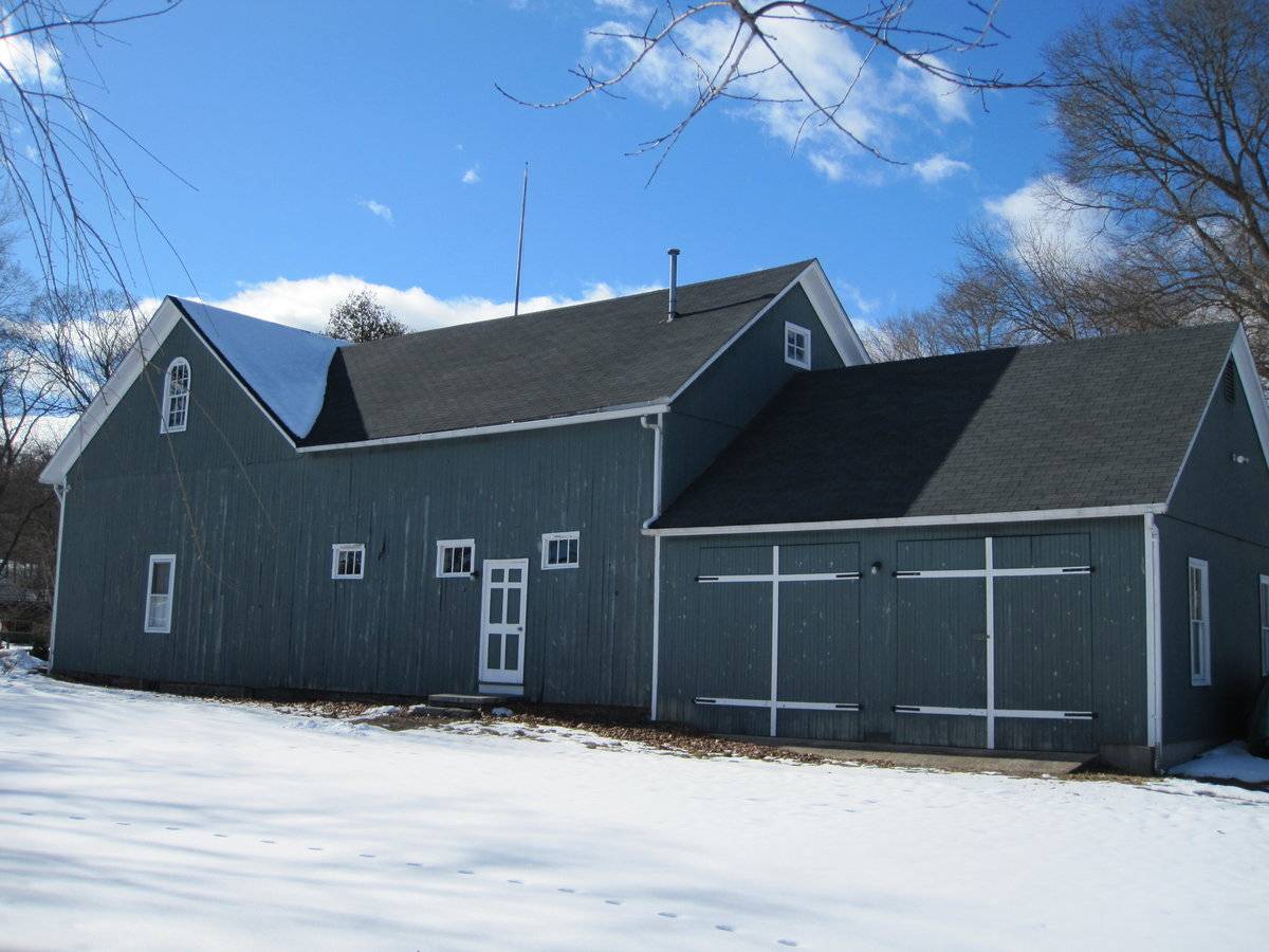 of the barn faces Main Street while the northeast eave-side cross-gable is intersected by a smaller 1-