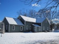 has two pairs of exterior swinging doors, with white trim. The northeast gable-end of the addition has two,