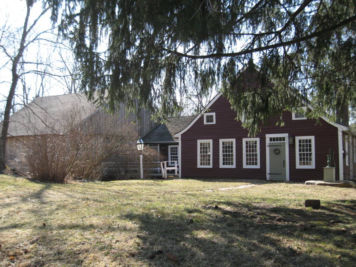 Located just south of the center of Ashford (the village of Warrenville) along the east bank of the Mt. Hope River. To the north, US Route 44 (known locally as Ashford Center Road or Pompey Hollow Road)runs east-west, and has most of the commercial and municipal services for the town. Mansfield Road crosses the southern part of Ashford, leading south into Mansfield. It is an area of some open fields, much woodland and wetlands along the Mt. Hope River, and scattered 19th-century farmhouses and 20th-century suburban homes. This .85-acre parcel is on the west side of the road, with the river bank close at the rear. In this area close to Route 44, houses are built close together. This house is a c. 1720 1 1/2-story colonial style, with its ridge-line oriented east-west perpendicular to the street. It’s entry door is in the east gable-end, off center to the right. There are three tweove-over-twelve double hung windows to the left (south) and one to the right (north) in the ground floor. There is a similar window above in the attic gable, and two six-pane awning-type windows, one at each side under the eaves. The roof has flared eaves. The front door is a plank door with iron strap hinges. The house is connected to the barn by a 1-story gable-roofed ell extending south from the south eave-side of the house and meeting the north gable-end of the barn.
