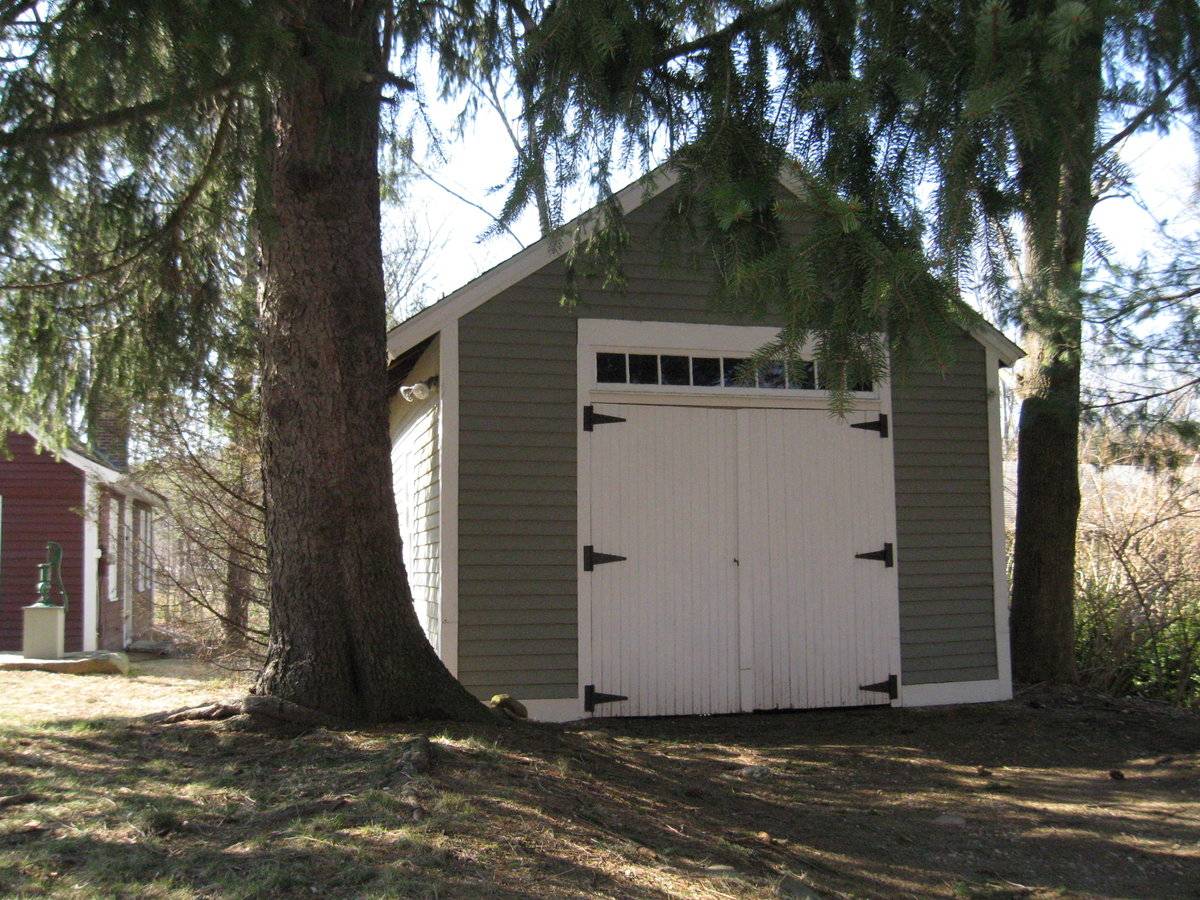 This is a 1 1/2-story gable-roofed bank barn with its ridge line oriented north-south parallel to the road. The lower level has three overhead garage doors in its south gable-end. Above is a sliding door flanked by two six-pane windows on the left and one on the right. The east facade has no openings at grade. The north facade is attached to a connecting addition to the house but appears to have been the entry facade originally. The west facade facing the river has an open porch on the main level; the interior has been converted to living space with windows looking west to the river view.