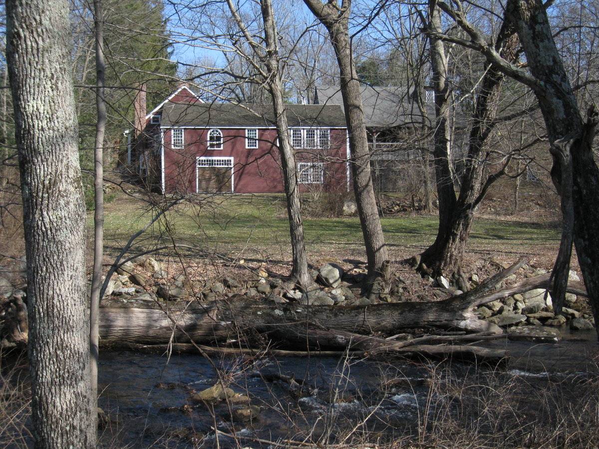 Photograph from Clouette survey pre-dates the addition connecting the house and barn. Barn converted to living space; west side visible from opposite bank of the river. Real estate photos of additional views.