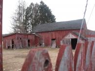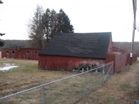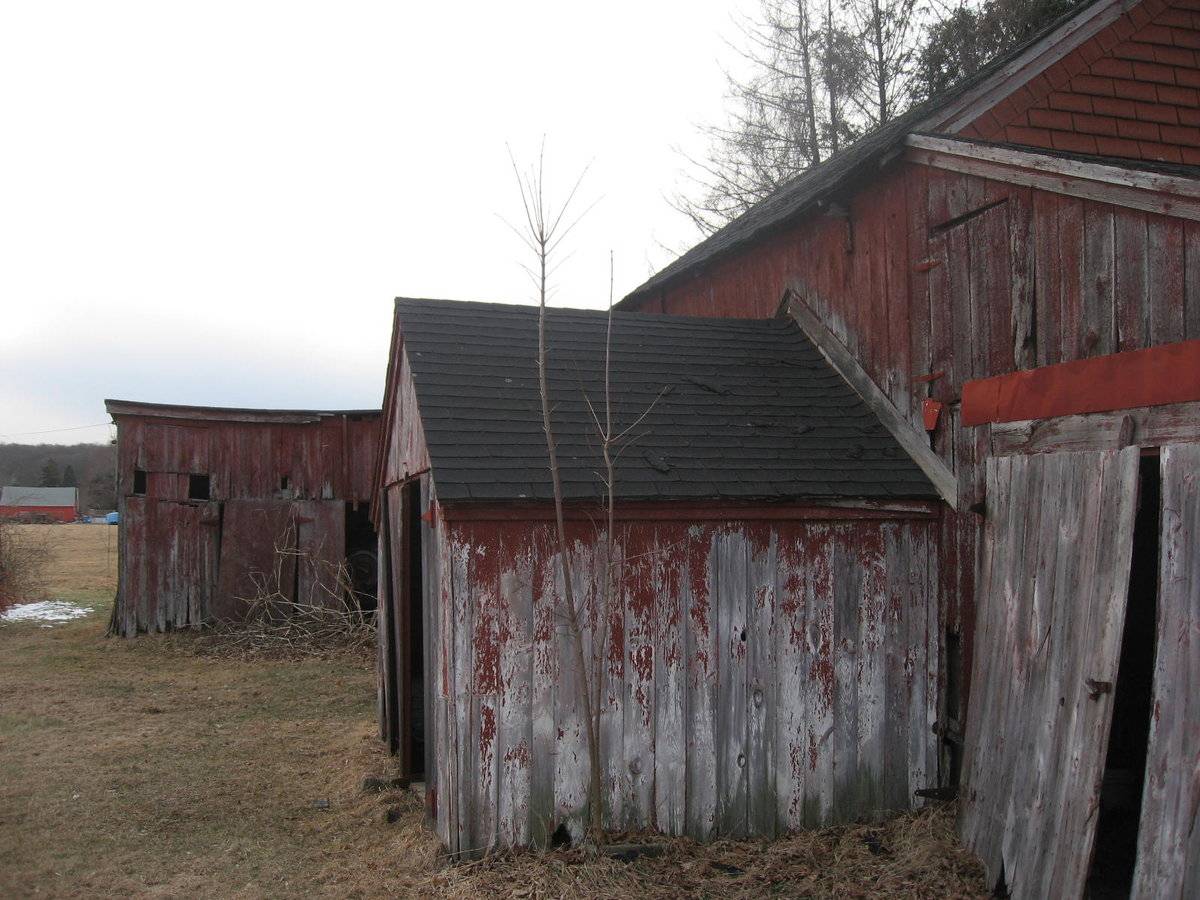 - @ corner of Bahr Road and Rte 80 - jumble of barns, some connected (not connected to house) - one could be English type (pic 03) - might be too damaged - rotted siding, failing roof lines - some sides are plywood, not board sheathing