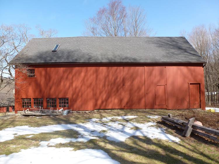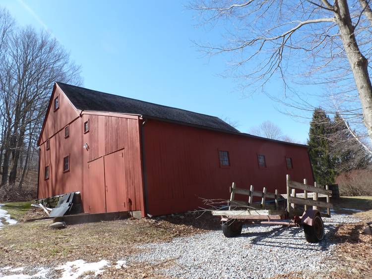 Listed on the State Register of Historic Places 3/05/2014. The Candlewood Hill Farm Barn is located behind the Captain John Smith House on Jacoby Road in Higganum. The oldest part of the barn dates from 1725-30. Typical of the English style barn it was originally built with three sections; a wooden threshing floor in the center, stables for dairy cows and horses on one side and a haymow or “bay” on the other. The interior features hand pegged timbers with markings which identified how it was assembled. In the 1870’s an additional bay was added and a lean-to addition, originally open, was constructed along the rear of the barn. For three generations the property was owned by the Smith Family. The first owner was Captain John Smith, a seafarer. His son John Jr., who inherited the house in 1808, was a blacksmith and while serving in the Revolutionary War is said to have helped forged the chain of links that was stretched across the Hudson River to stop British ships. The current owner, since 1966, has a chain of large links which was found in the barn and may have belonged to John, Jr. John Smith III, who was also a blacksmith, farmed the surrounding land and the property remained in the family until 1899. In the mid- 20th century Joseph Harrington and his wife Mae came to the Higganum farm from New York and raised strawberries and grapes which were sold at Rozniaks in Higganum. Mr. Harrington was the author of the Lieutenant Kerrigan mystery series. The property also features a “creamery”, a small building used to house pans of milk to separate the cream and produce by-products such as butter. Today the barn is lovingly maintained and continues to serve the property for storage, workshop and an occasional wedding reception.