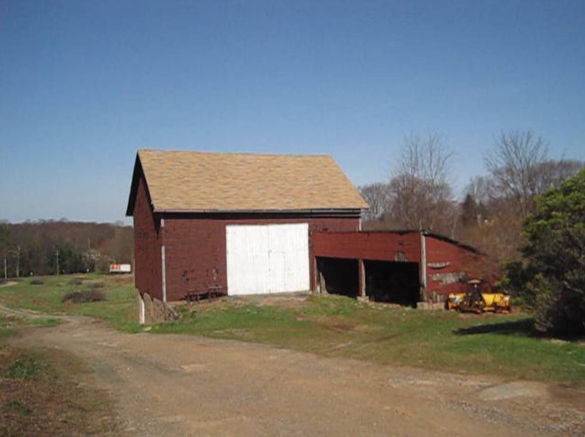 The barn is located towards the southern edge of the property offset from New London Turnpike. The ridge line of the barn runs almost north-south, but an angle at to the road which runs from the southeast to the northwest. A hip-roof barn is located towards the south-east of the barn, across the driveway while another hip-roof out-building with a square footprint is located towards the east. The circa 2010 main residence is located towards further south-east of the barn. The property has a water stream along its southern edge with parcels of open land along the eastern edge. Cluster of trees and few sheds can be seen scattered in the property while the area towards the east and the southeast is covered by dense woodland.