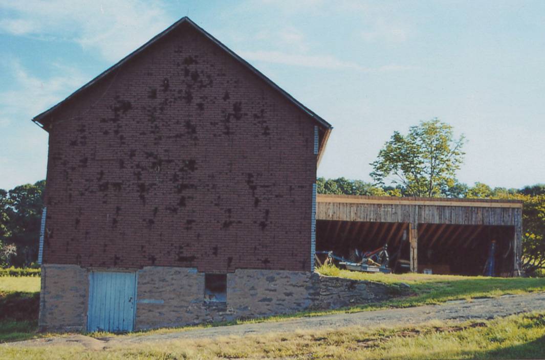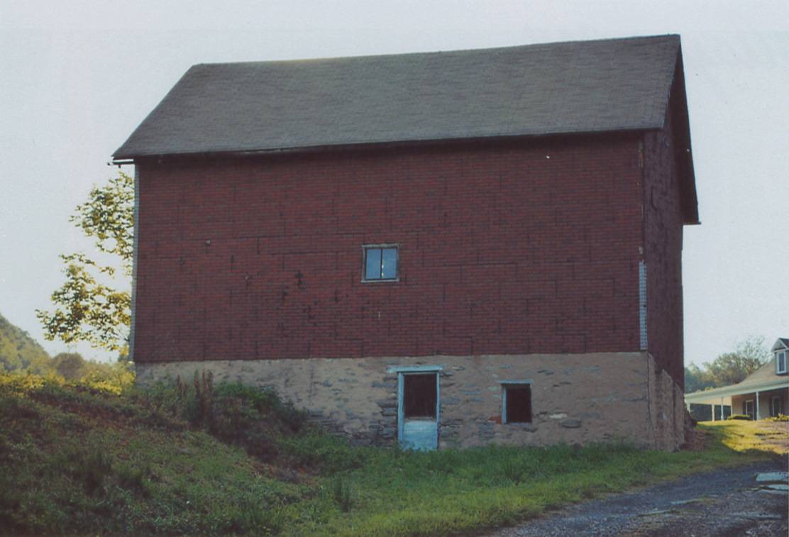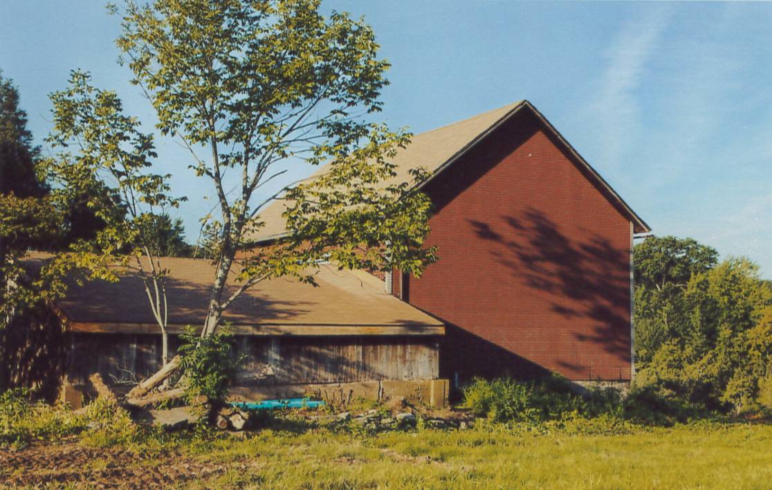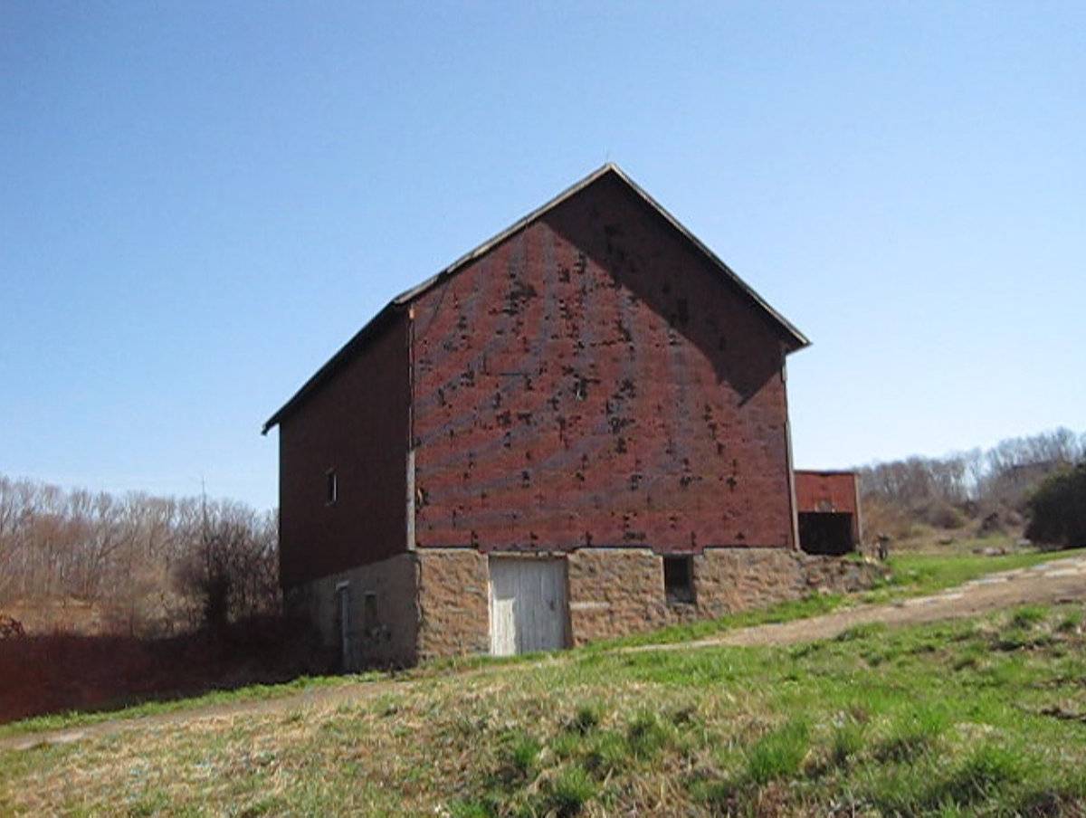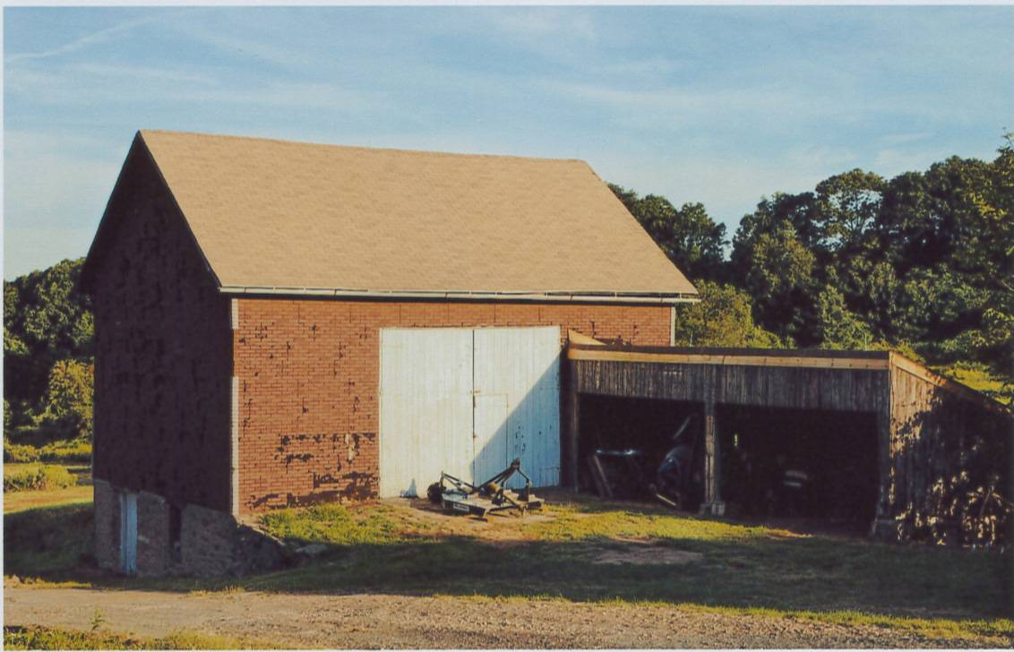 Listed on the State Register of Historic Places 10/02/2013."There is a barn on my property in Glastonbury that was there when my Grandfather purchased the farm in the early 1900s. I doubt if it's registered but it is in good structural condition. It is constructed with hand cut beams and wooden pegs to join them. As a child I remember watching my Grandmother milk the few cows they had in the lower portion, hay trap doors above to drop the hay through. My family grew fruit on this farm - apples, peaches, pears etc. The livestock was for their own consumption like lots of folks in that era. Anyway I myself am curious about its possible age of construction. It also has an attached carriage shed with built up stone and dirt ramp to the large swing doors." - John B. English bank barn with hinged doors & shed-roofed wagon shed attached. Brick apple barn for cold storage of apples, c. 1940.