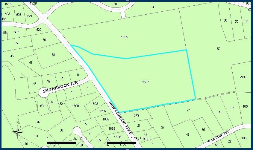 The 15.98 acres property, property number - 47601597, property ID - 12700, is located towards the east of New London Turnpike. The property is situated a predominantly residential area of rural character with woodland separating the individual plots. Residential plots can be seen towards the north, east, south and the west of the property across the road. Dense woodland can be seen along the edges of the property and covers the area towards the southeast.