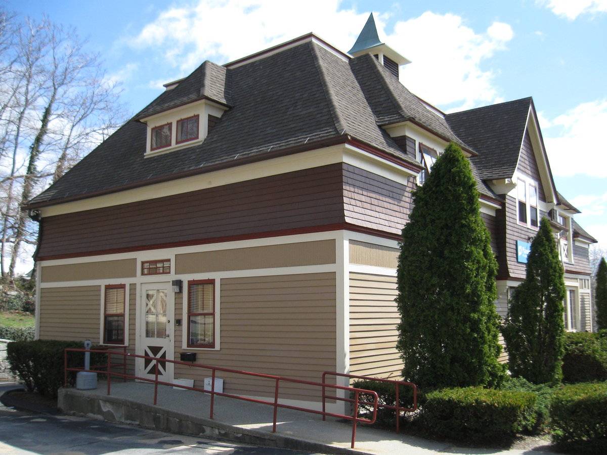 This is a one-story with full attic, mansard-roofed structure oriented with its facade facing southwest toward the street. The primary facade has a central gable-roofed dormer in the attic over a projecting hood supported by brackets. A pair of six-over-six double hung windows is located in the dormer and also below the hood. Flanking are matching hip-roofed dormers in the attic, each with a pair of two-light awning windows (the right pair has paneling below). Below these at the ground level are matching openings now filled by windows and panels, but these appear likely to have been the barn door locations originally. An entry door is located between the projecting roof hood and the right-hand window opening; it has an eight-light transom sash above. This main facade has horizontal clapboard siding from the foundation up to the window heads; above is a band of trim and bead-board panels, and above is a shingled course below the eave line. The central attic gable has scalloped shingle siding and the rake boards are supported by brackets at the eave line.