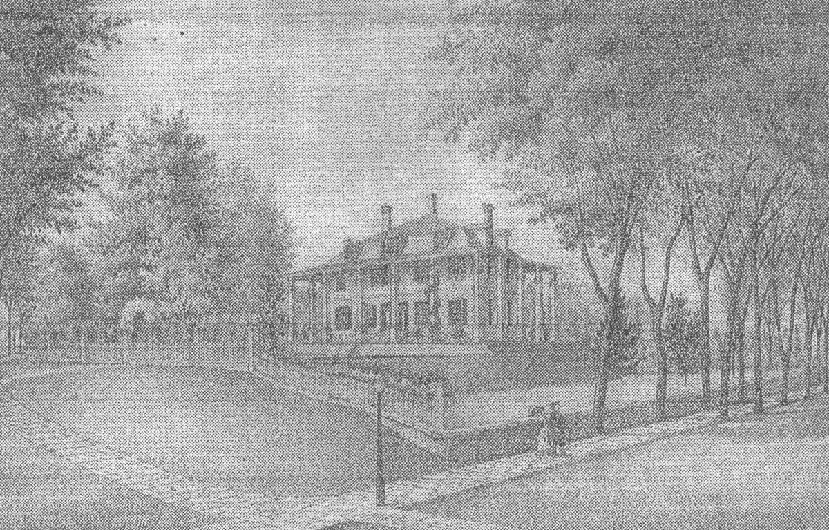 The roof is asphalt shingles and at the center of the ridge there is a cupola with a steep copper-clad hipped roof flared at its eaves.
