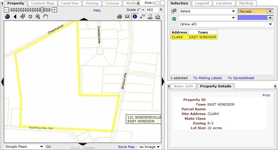 The 22 acres property, Map Number - 37 63 003, is towards the west of Windsorville Road, the south of Chamberlain Road and the north of Apothecaries Hall Road. The land with outbuildings is located in a predominantly residential area of rural character, across 121 Windsorville Road. Residential plots can be seen towards the east and further east of the property, across Windsorville Road while dense woodland covers the area towards the west and the north, across Chamberlain Road.
