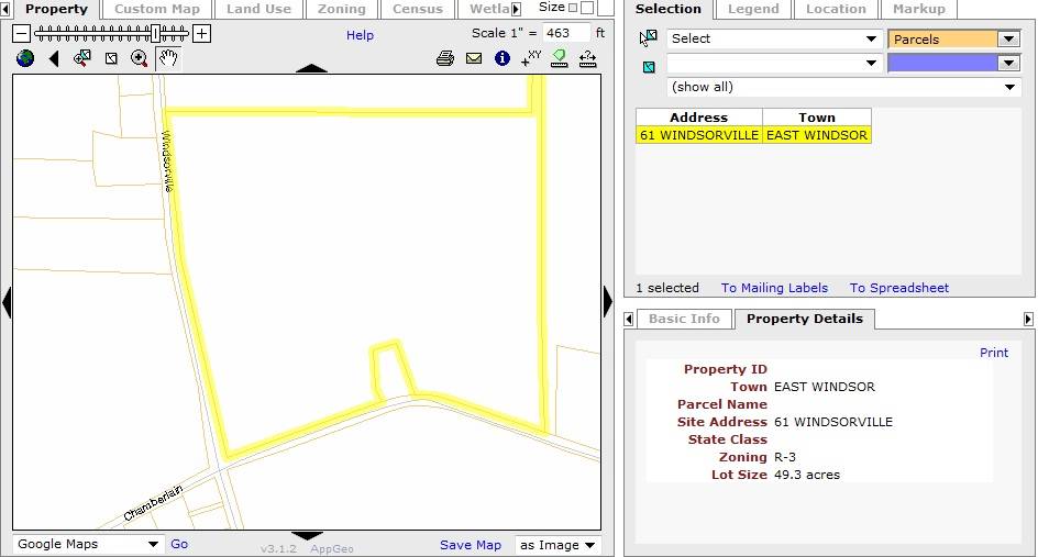 The 49.3 acres property, Map Number - 31 57 028, is a corner plot towards the north of Chamberlain Road and the east of Windsorville Road. The property is located in a predominantly residential area of rural character, separated from the surrounding plots by dense woodland. Residential plots can be seen towards the west of the property across Windsorville Road while parcels of open land can be seen towards the north and the south, across Chamberlain Road.