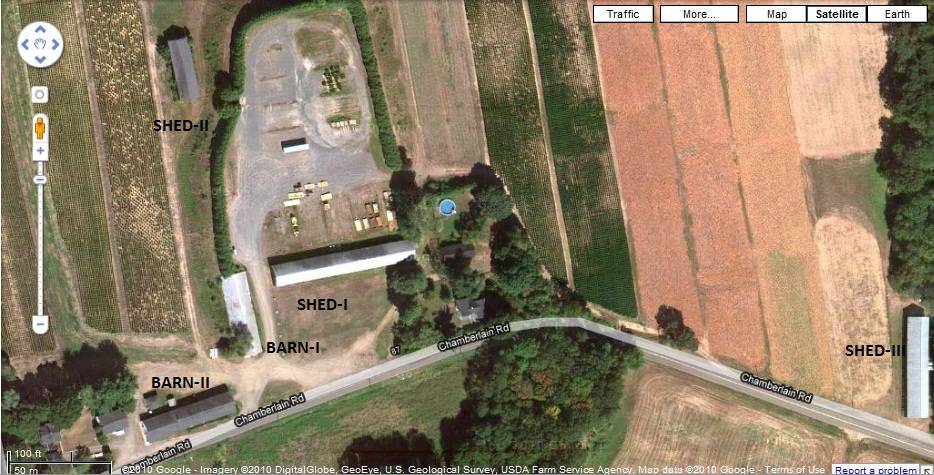 The property includes three tobacco sheds, Sheds-I, II & III and two barns, Barn-I & II. The circa 1890 colonial main residence is located in the south-western corner of the property surrounded by dense woodland towards its north and the west. The tobacco shed, Shed-I is towards the southern edge of the property with its ridge line running east-west while Shed-II is located in the south-eastern corner of the property with its ridge line running north-south. The semi-subterranean barn, Barn-I can be seen towards the south-west of Shed-I while the third tobacco shed, Shed-III is located towards the north of Barn-I. The ridge lines of both Barn-I and Shed-III run north-south, parallel to each other and almost perpendicular to the road. Barn-II is located towards the south-west of Shed-I, abutting to Chamberlain Road. A 1 ½- story eave-entry gable-roof shed can be seen towards the west of Barn-II. The ridge lines of Barn-II and the shed run east-west parallel to the road. The property has few smaller sheds and outbuildings scattered over the site with parcels of farm land practicing active agriculture towards the east, west and the north.