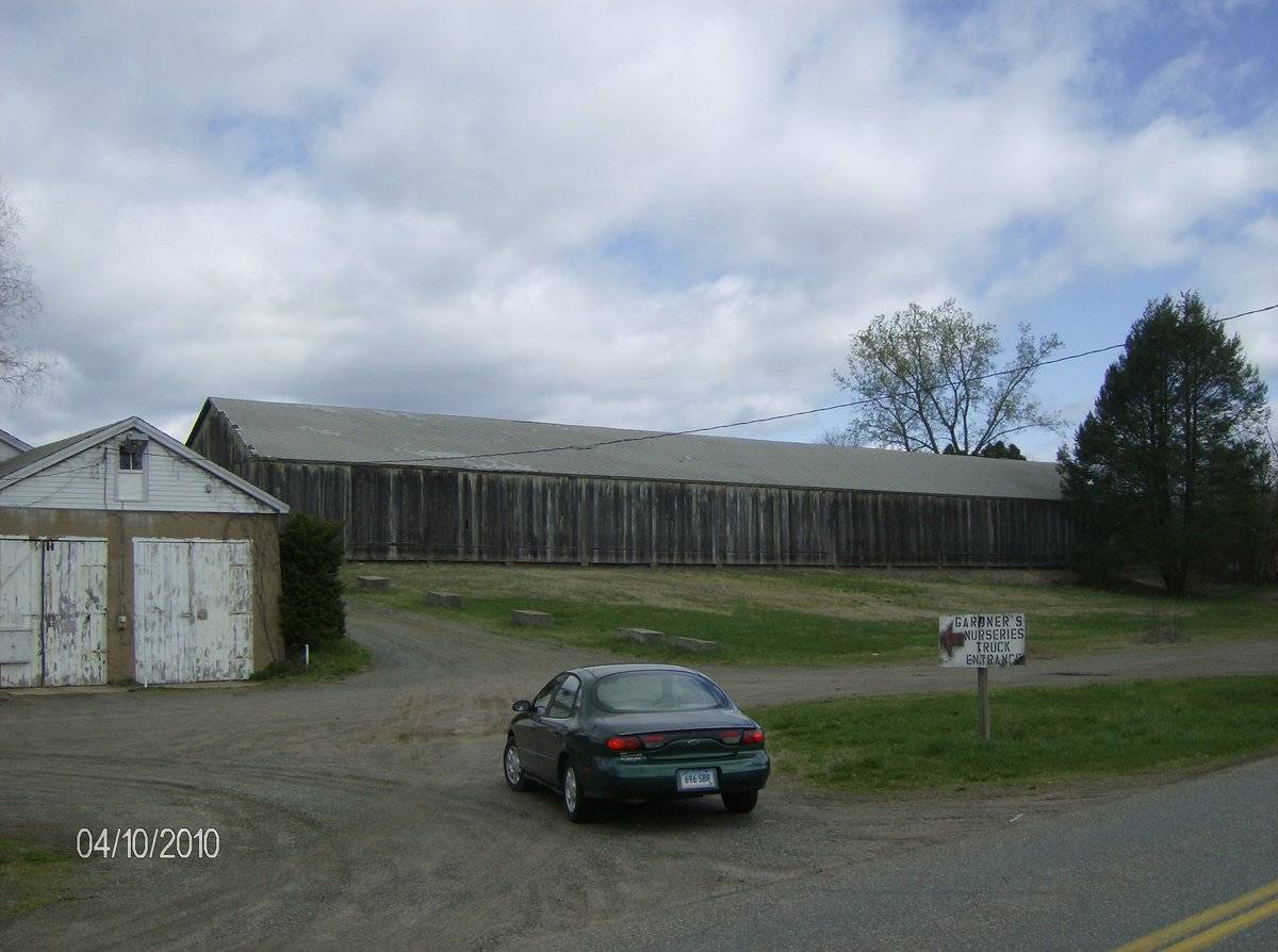 Tobacco shed visible from parking lot of Gardner's Nursery. Shed is on Chamberlain Rd but address of nursery is 77 Windsorville Rd. Also see part 12/3 and part 3/3 - http://www.connecticutbarns.org/index.cgi/20831 http://www.connecticutbarns.org/index.cgi/34903