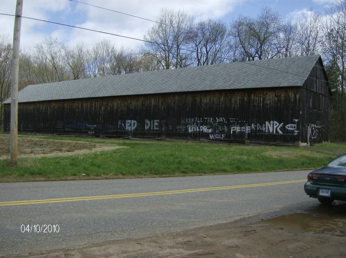 The shed is in the west portion of the 6.11 acre lot. The house that shares the address is in the east portion of the lot, although they both front Chamberlain Road. The ridge-line of the house is perpendicular to the ridge-line of the shed. Separating the two is a large patch of trees. To the west of the shed is woodland. To the west and northwest are large tracts of open space. Across the road are tracts of open space. The area surrounding the site is light residential, active agriculture, open space and woodland.