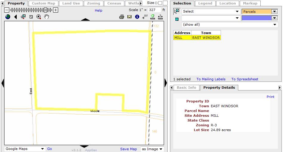 The 24.89 acres property is a corner plot towards the north of Middle Road and the east of East Road, bordering the town line of East Windsor and Ellington. It is situated in a pre-dominantly residential area of rural character, surrounded by farm land. Parcels of farm land with active agriculture can be seen towards the east and the north of the property and towards the west and the south, across East Road and Middle Road. A few residential plots can be seen towards the southeast of the property. The property engulfs the residential plot at 73 Middle Road on three sides.