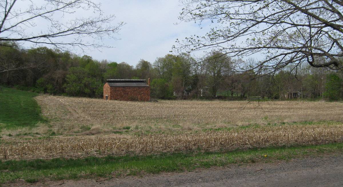 Auer Farm Hill Road proceeds down the hill in a curving northeast direction to a tilled field on its north border, which contains the mushroom barn to end at Simsbury Road. The mushroom barn is in the north half of the tilled field. Simsbury Road is the east border of the tilled field and property. Woodland makes the north border of the tilled field and mushroom barn. West of the mushroom barn and tilled field are more open fields bordered by woodland and wind breaks. South of the mushroom barn and Auer Farm Road is a rural field with sheds V and VI. The T intersection between Auer Farm Road and Simsbury Road is the northeast corner of the field with signage pointing the way to the farm complex. The size of Auer Farm is 120 acres. The area around the property is rural, residential, open land, and woodland.