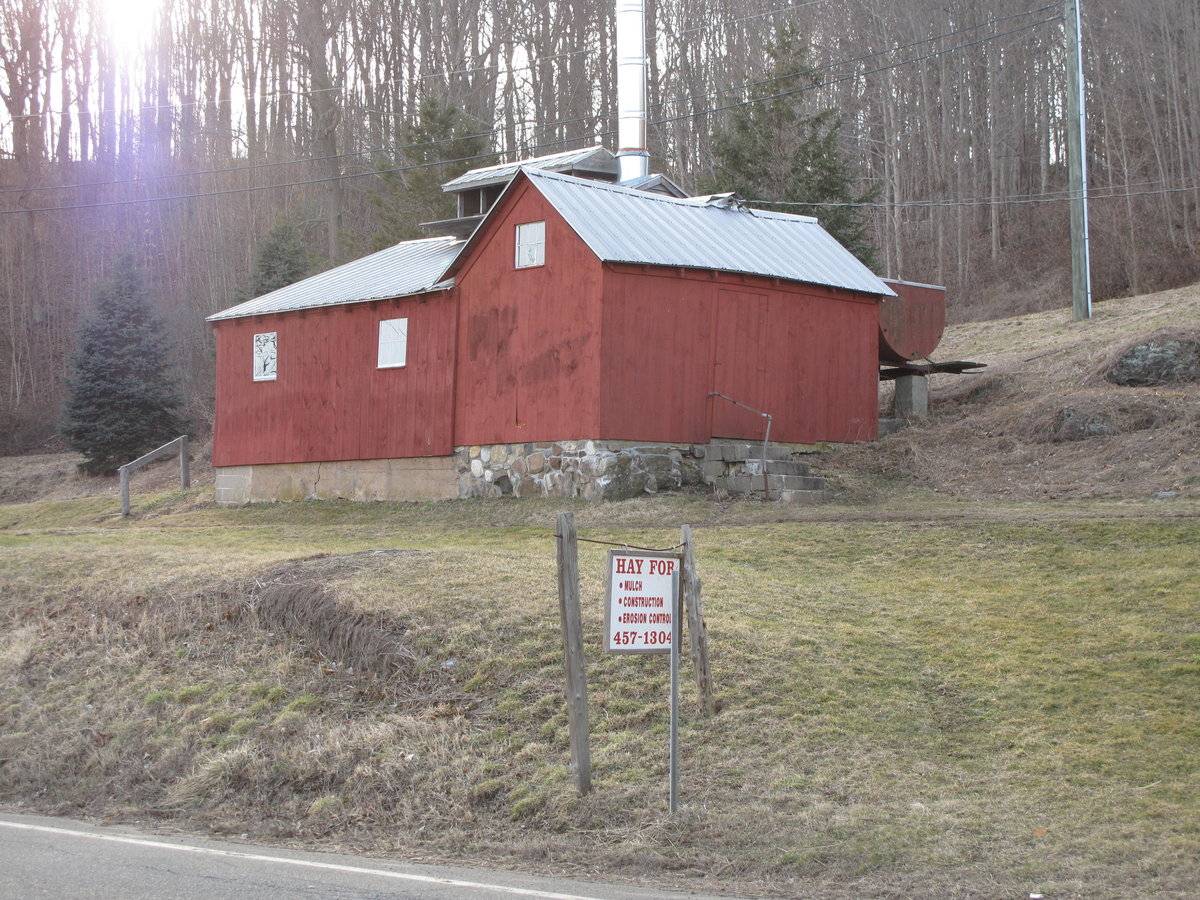 This is a 1 ½-story eave-entry barn with a gable-roof addition on its northeast gable-end and a small shed-roof addition on its southwest gable-end. The main facade faces northeast in the eave-side of the addition. The ridge-line of the original section runs northwest-southeast, which is parallel to Durham Road at this point. The ridge-line of the main barn is perpendicular to that of the addition and is wider than the main barn; the southeast eave-side of the addition is flush with the southeast gable-end of the main barn, but the northwest eave-side of the addition extends beyond the northwest gable-end of the main barn. The main entrance is a single pass-through door centered on the northeast eave-side of the gable-roof addition. Concrete steps lead up to the entrance. The southeast gable-end of the gable-roof addition has a six-pane window in the gable attic. The grade is lower at the southeast corner and there is an exposed field-stone foundation at that end. The southeast eave-side of the main barn has two evenly-spaced six-pane windows. There is an exposed concrete block foundation on this end of the barn due to the change in grade. The southwest gable-end of the barn has a small one-story shed-roof projection centered on it. The projection is flanked by six-pane windows. Centered on the ridge-line of the barn is a long ventilator. On the northwest gable-end of the gable-roof addition is equipment for the maple syrup production. Both sections of the sugar house have vertical flush-boards painted red with white trim around the windows. The roofs, which are covered in tin, have a slight projecting overhang and have exposed rafter tails on the eave sides. The foundation is mortarted fieldstone on the original section and the addition has a concrete block foundation.