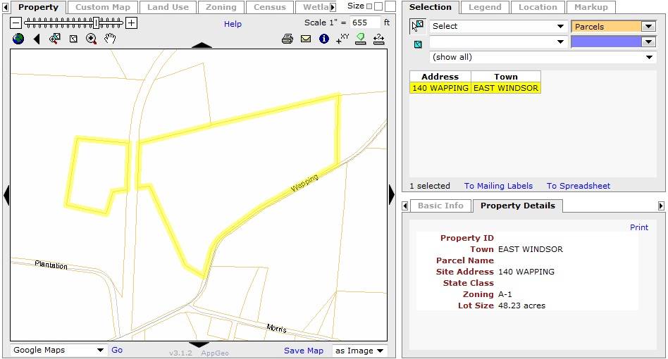 The 48.23 acres property, Map Number - 41 65 008 034, is towards the north of Wapping Road located in a pre-dominantly residential area of rural character. Dense woodland can be seen towards the south-west and the north of the property while tobacco fields with active agriculture and tobacco sheds can be seen towards the west and the south, across Wapping Road. The western portion of the property is separated from the rest of the plot by railway tracks.