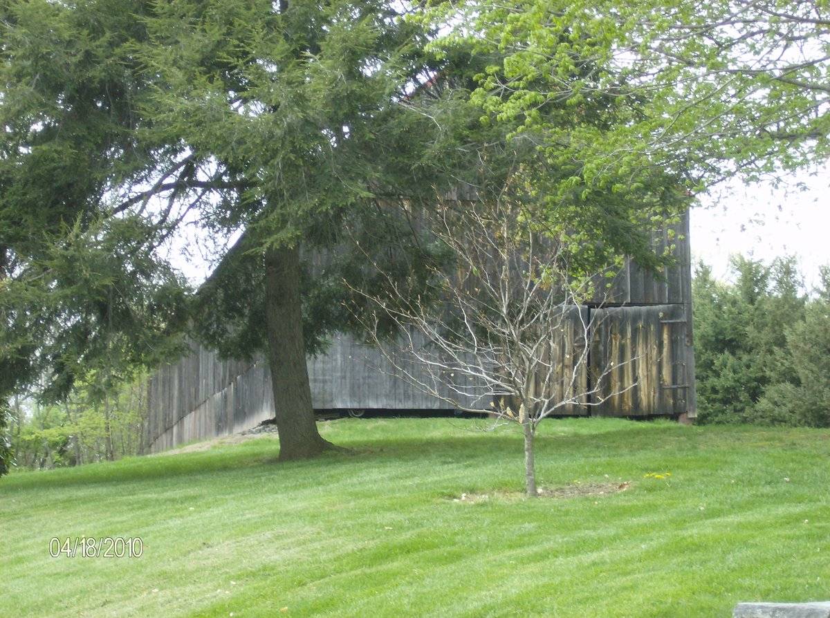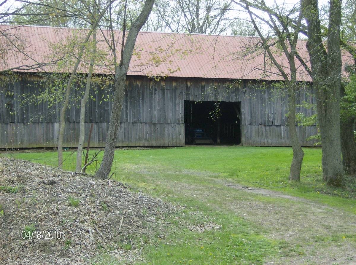 Tobacco shed converted to some other use. Red metal roof and large entry cut into north side.