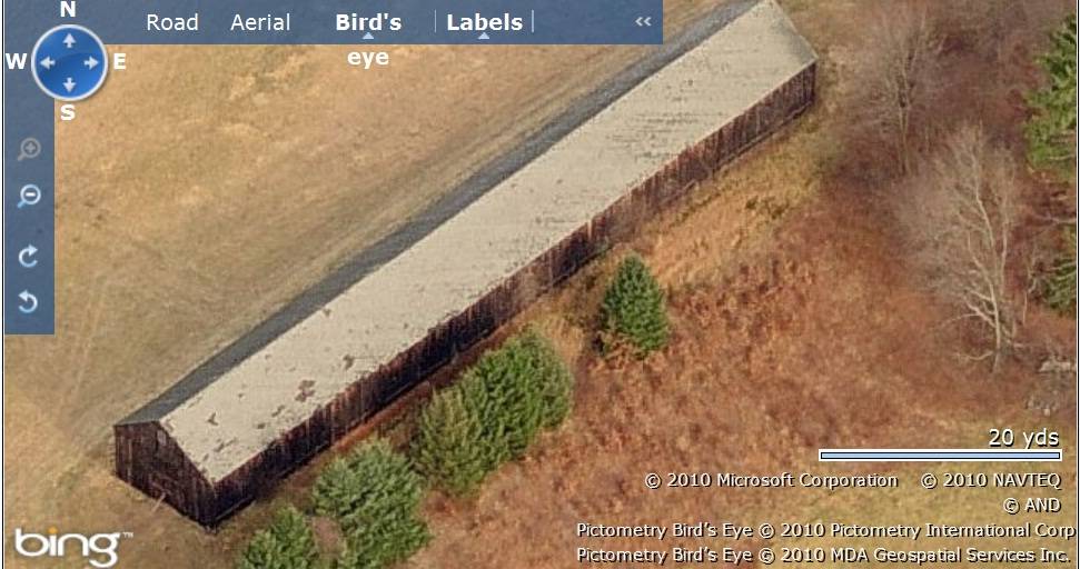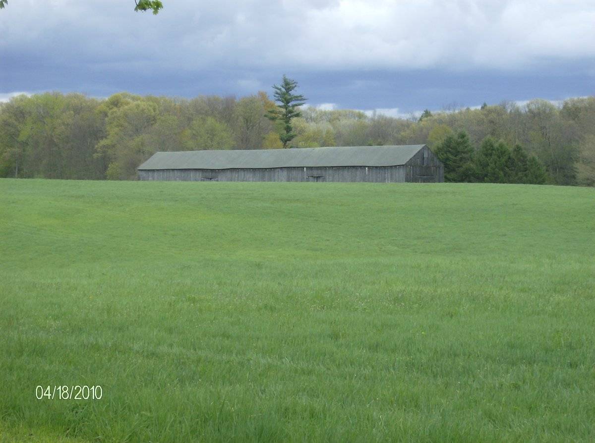 The tobacco shed is almost at the center of the property with open land towards its west and dense woodland towards its east. The ridge line of the shed runs north-south, almost parallel to Rye Street. The circa 1985 ranch main residence is located in the north-eastern corner of the plot, accessed by a driveway from the west. The western edge of the property along Rye Street is demarcated by a row of trees with parcels of open land covering the area towards the west. Dense woodland can be seen towards the east of the tobacco shed and beyond.