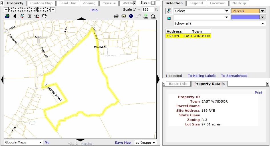 The 97.01 acres property, Map Number - 35 49 030, is located towards the east of Rye Street in a pre-dominantly residential area of rural character. Residential plots can be seen towards the south and the west, across Rye Street while parcels of farm land can be seen towards the north across Dempsey Road. Dense woodland covers the area towards the east of the property.