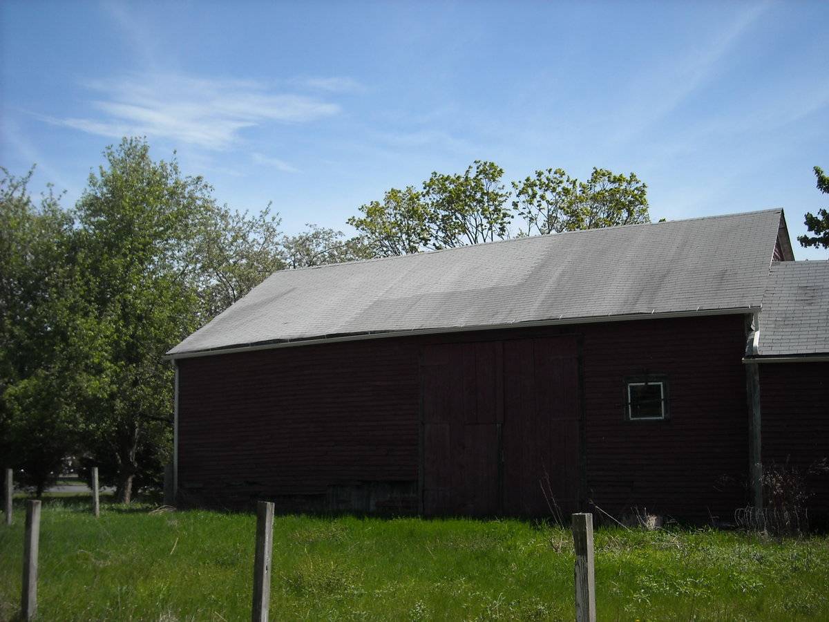 This is a L-shaped barn complex comprising of the main 1 ½- story eave-entry barn with its east eave-side intersected by a 1 ½ -story gable-roof barn and a 1- story gable-roof addition on its south gable-side. The north gable-side and the east eave-side of the main barn face Rainbow Road while the ridge line runs north-south at an angle to the Road. The main façade of the barn complex is the west eave-façade of the main barn with the main entrance towards the south through a pair of double-height hinged wagon doors with blacksmith hardware. A four-pane window insert can be seen towards the south of the main entrance. The south gable-side of the main barn has a 1- story gable-roof addition towards the west and a square window towards the east. A similar square window can be seen on the south gable-side just below the apex of the roof. The east eave-side of the main barn has an entrance at the center through a pair of hinged wagon doors with blacksmith hardware. A six-pane stable window can be seen towards the south on the east eave-side while a paired six-pane stable window can be seen centered above the wagon door entrance. The 1 ½-story intersecting gable-roof is towards the north on the east eave-side with its north eave-side flush with the north gable-side of the main barn. The combined north-side of the barn complex has at least seven six-pane stable windows equally spaced at the first floor level. A hinged hay door can be seen centered on the north eave-side of the intersecting gable-roof at the second floor level.