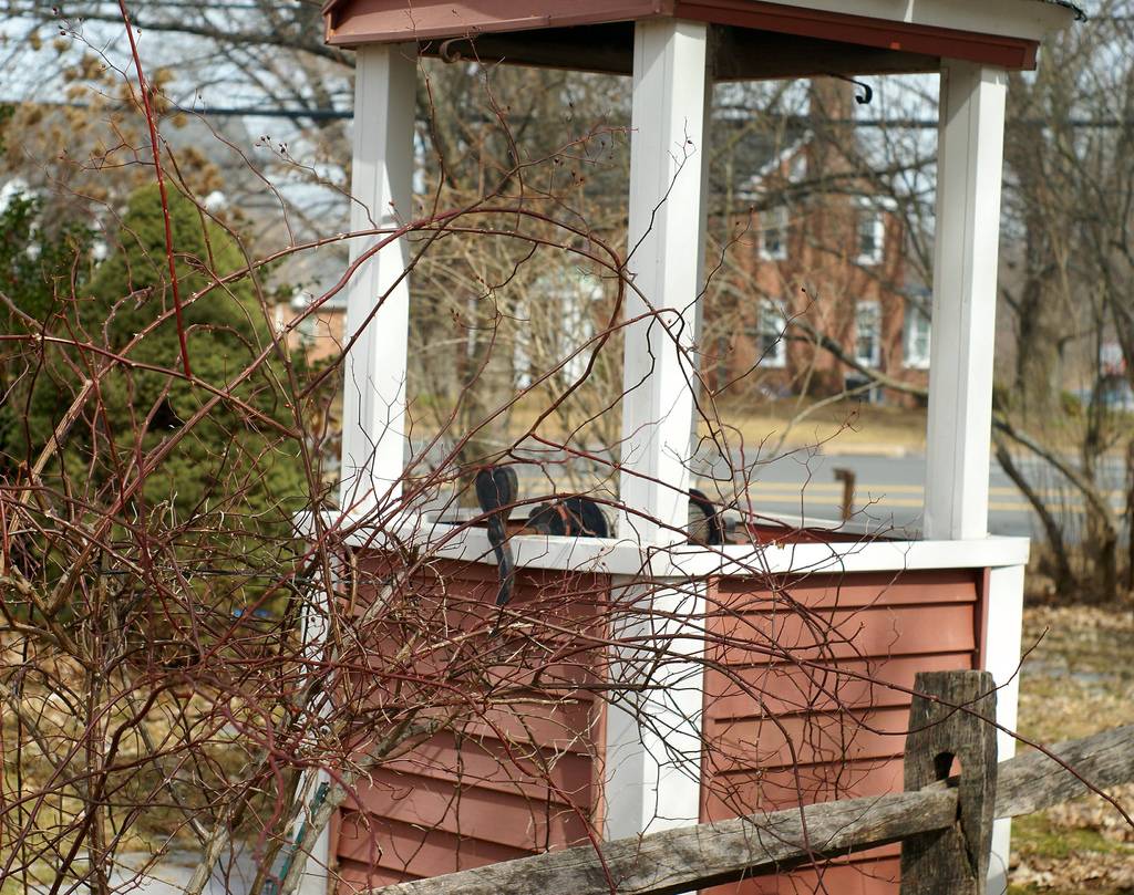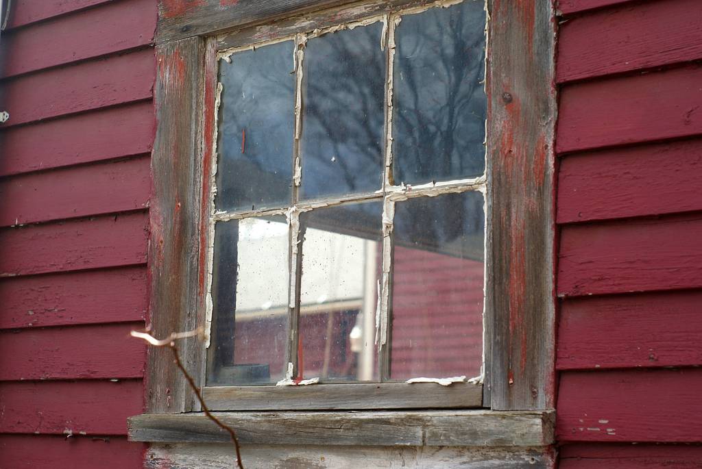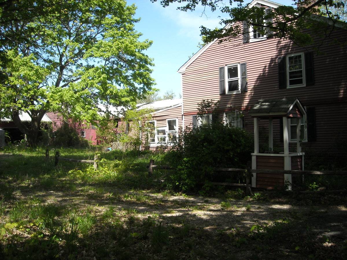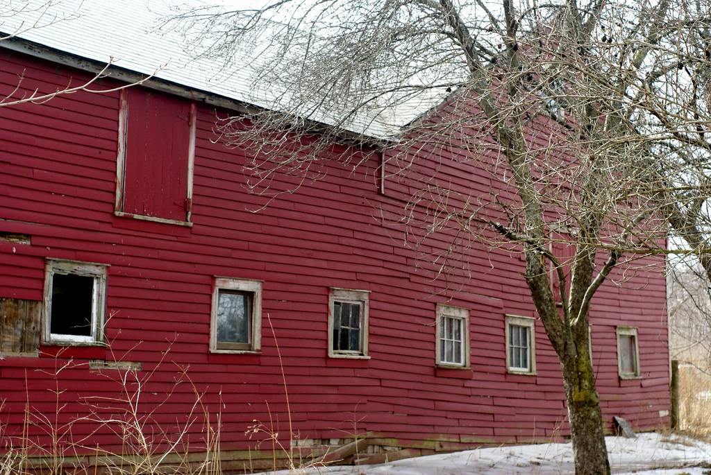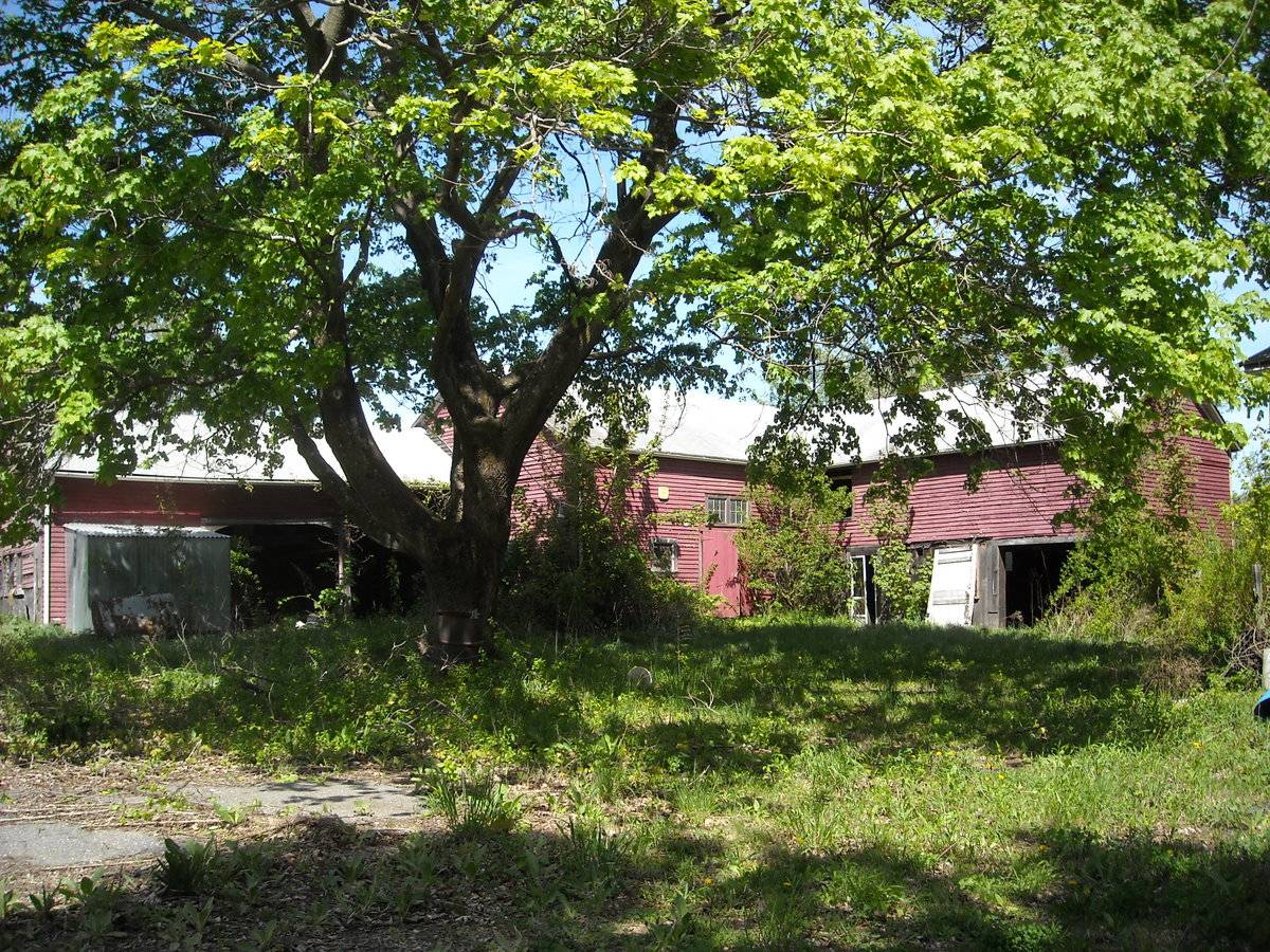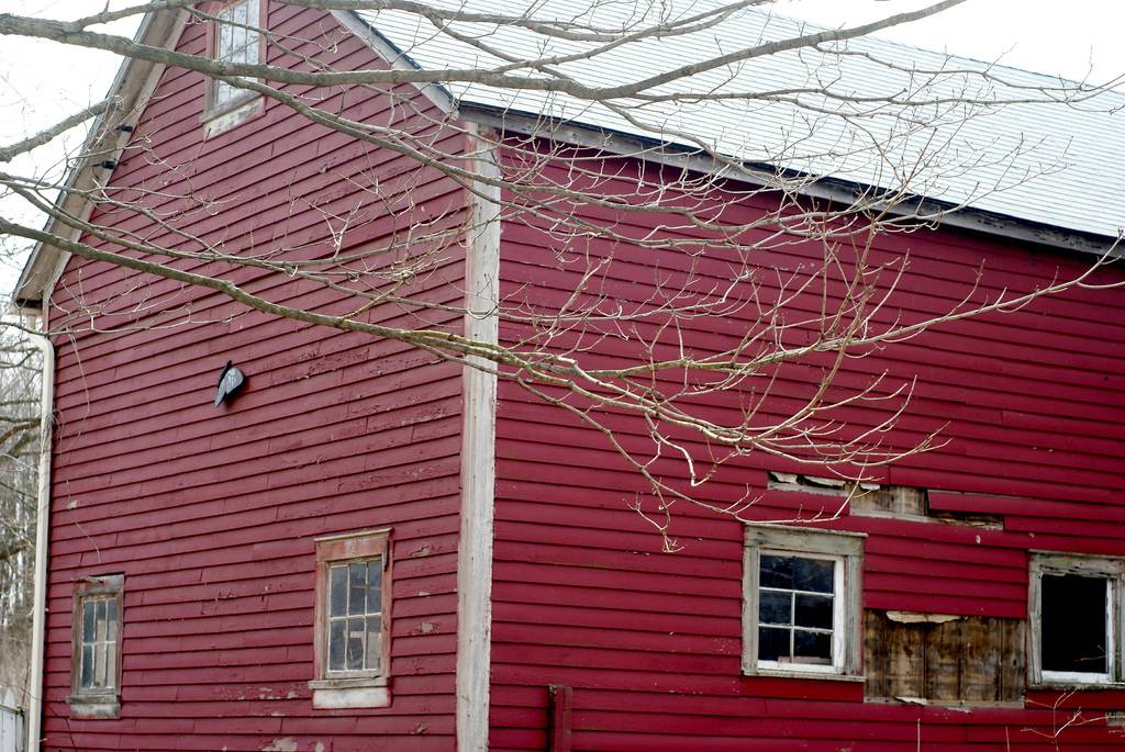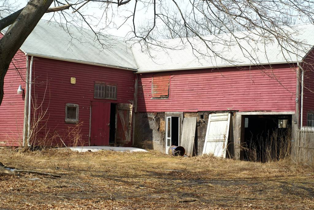 The wooden frame of the barn complex is supported on concrete foundation and has red painted horizontal clap board siding walls with white corner boards. The barn complex has asphalt shingle roofing.