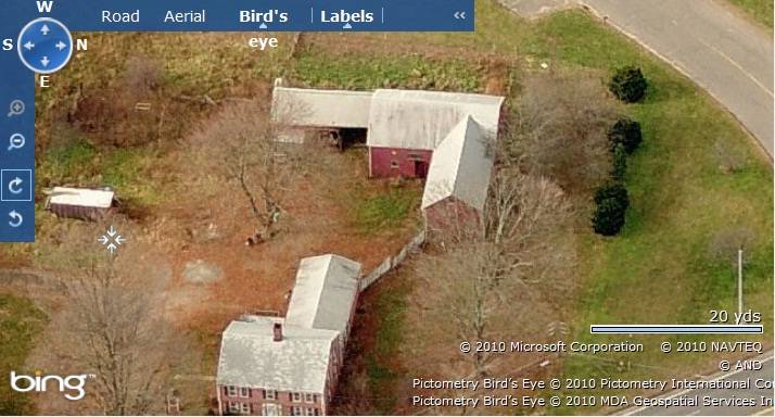 The barn is towards the northern corner of the property with the circa 1785 Colonial/Greek revival main residence towards its south-east. Clusters of trees separate the barn from the main residence and the road. Dense woodland can be seen forming the southern edge of the property.