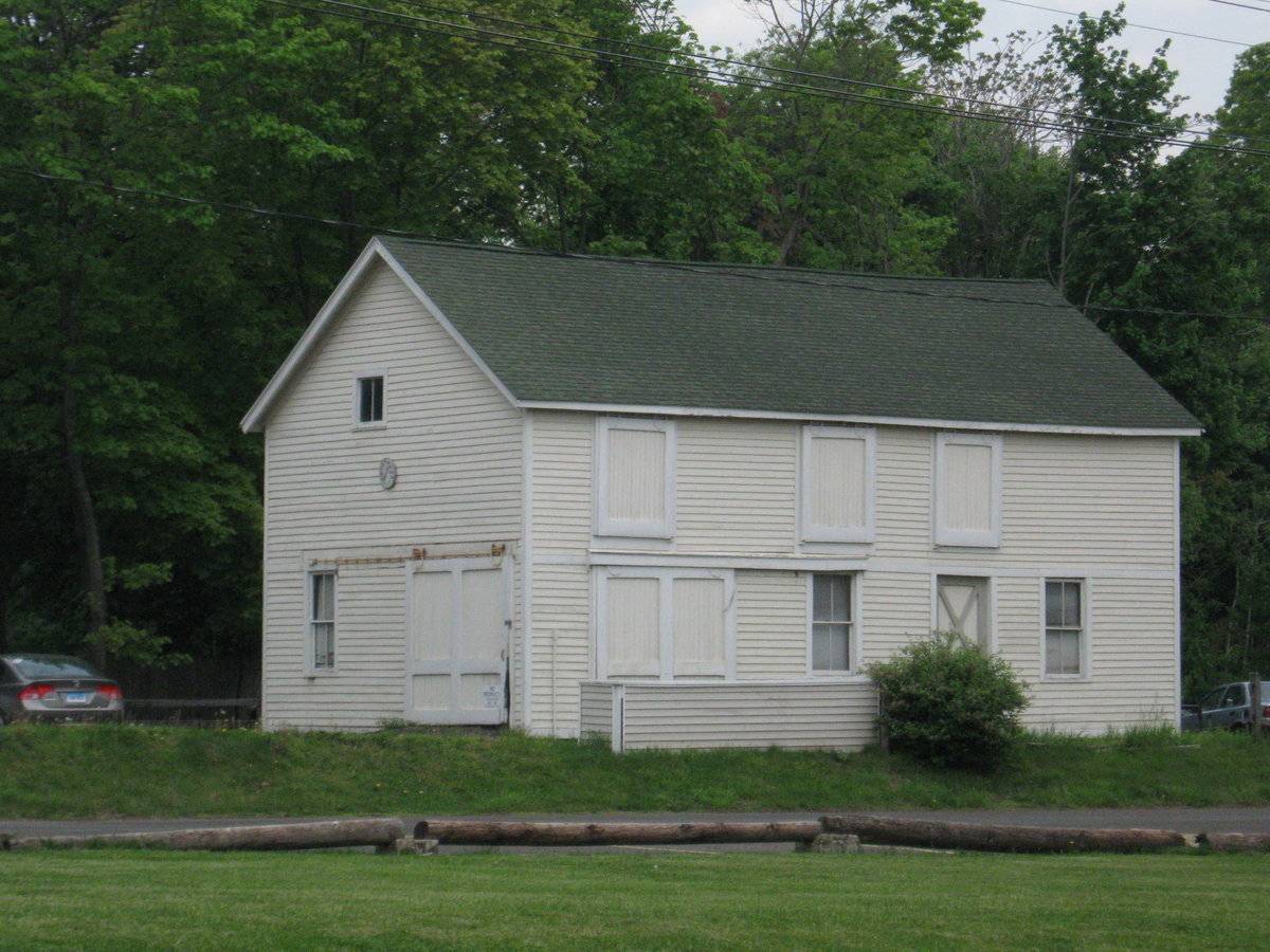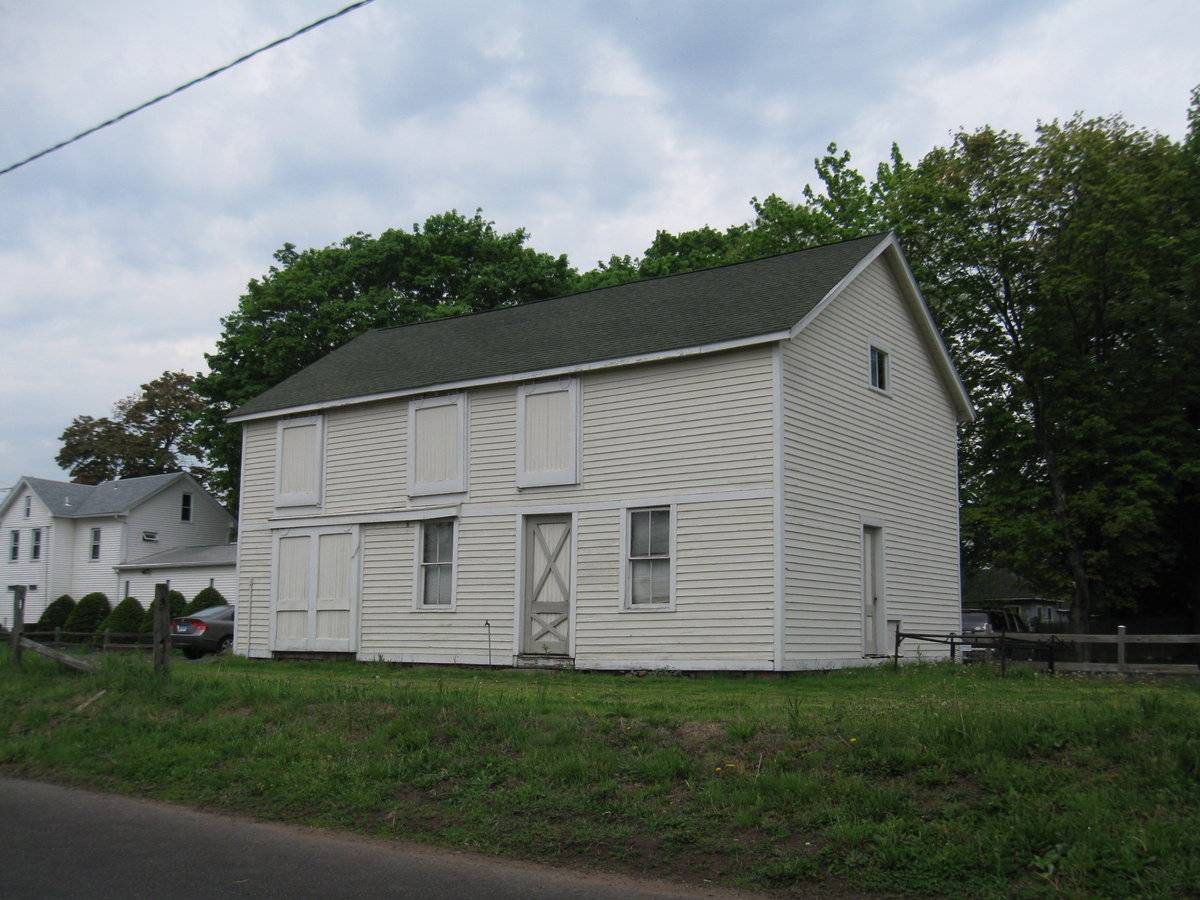 The barn has three main doors from three sides with a pass-through entrance from the rear gable end. It has a thermometer on the gable side facing the main house. This carriage house is a contributing resource in the Branford Center National Register Historic District.
