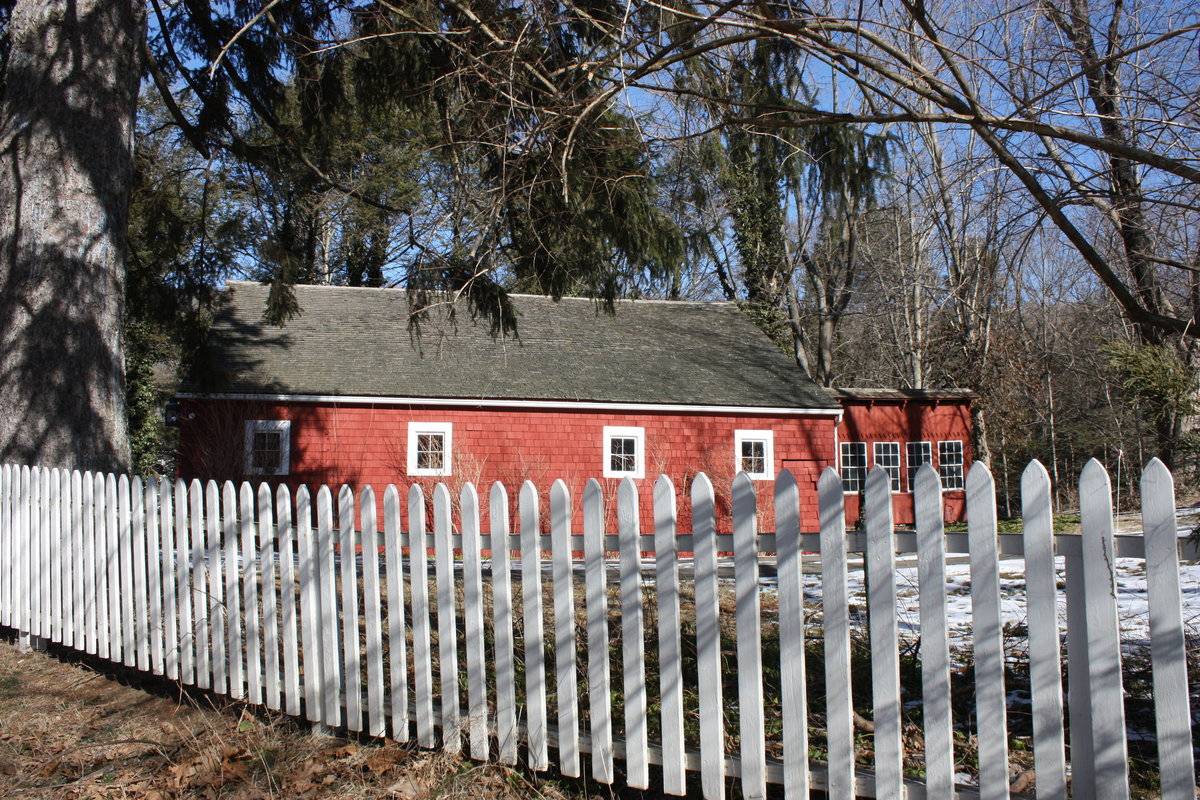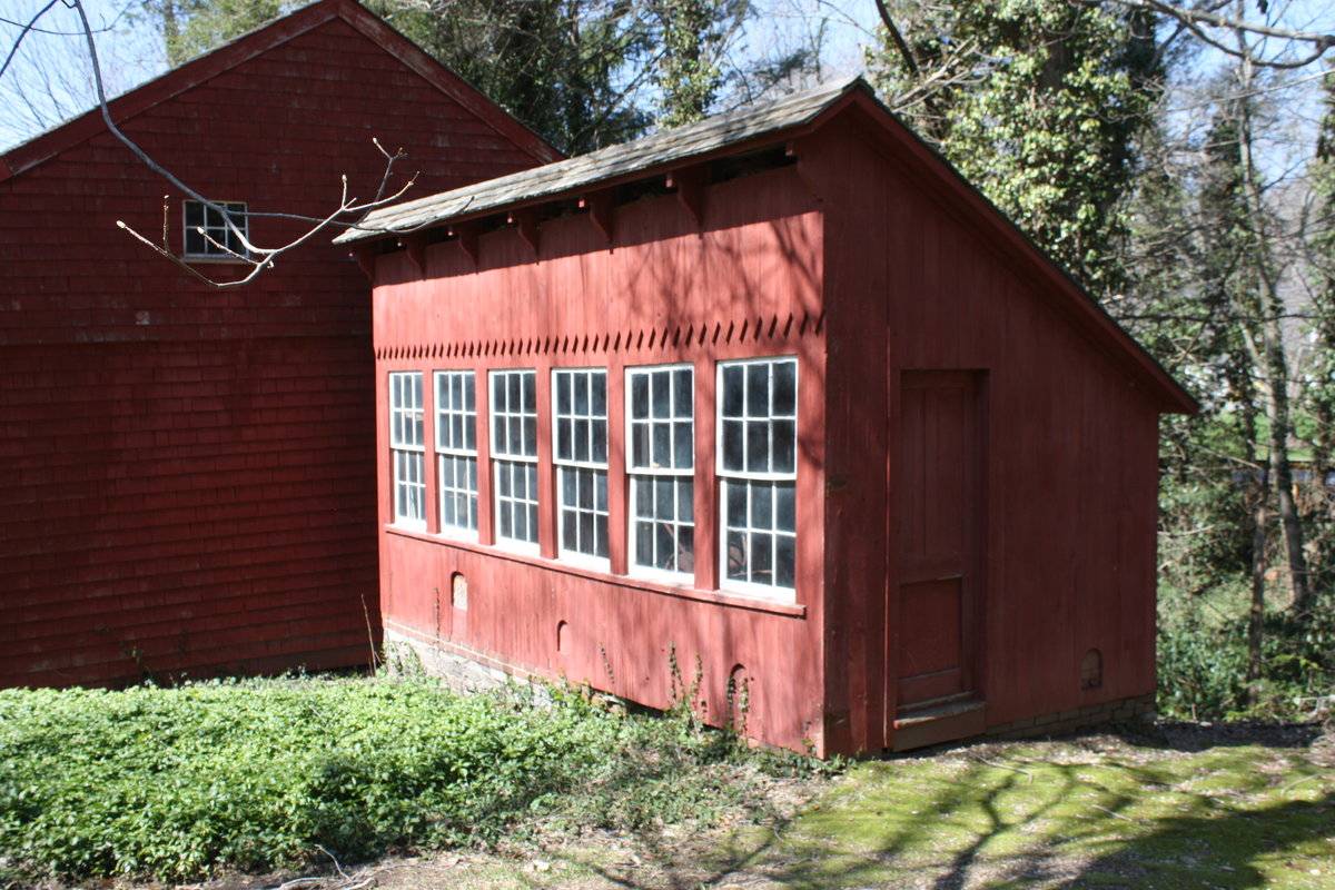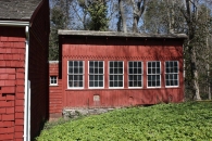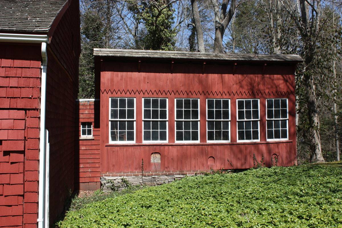 The chicken coop along the eastern gable-façade of the barn has a saltbox-roof with its ridge-line off-centered towards the south forming a much lower eave-level along the northern eave-façade. The southern eave-façade of the chicken coop has a row of six six-over-six double-hung sliding windows with three arched-feeding holes near the grade level. A distinct siding divide line finished in saw-tooth detail can be seen just above the windows. The barn has a horizontal slit for ventilation along the southern eave-level with the roof above supported by series of brackets. Undulating grade level along the façade reveals field-stone masonry foundation towards the west. The eastern eave-façade of the chicken coop has a pass-through door towards the south and an arched feeding-hole near the grade level towards the north.