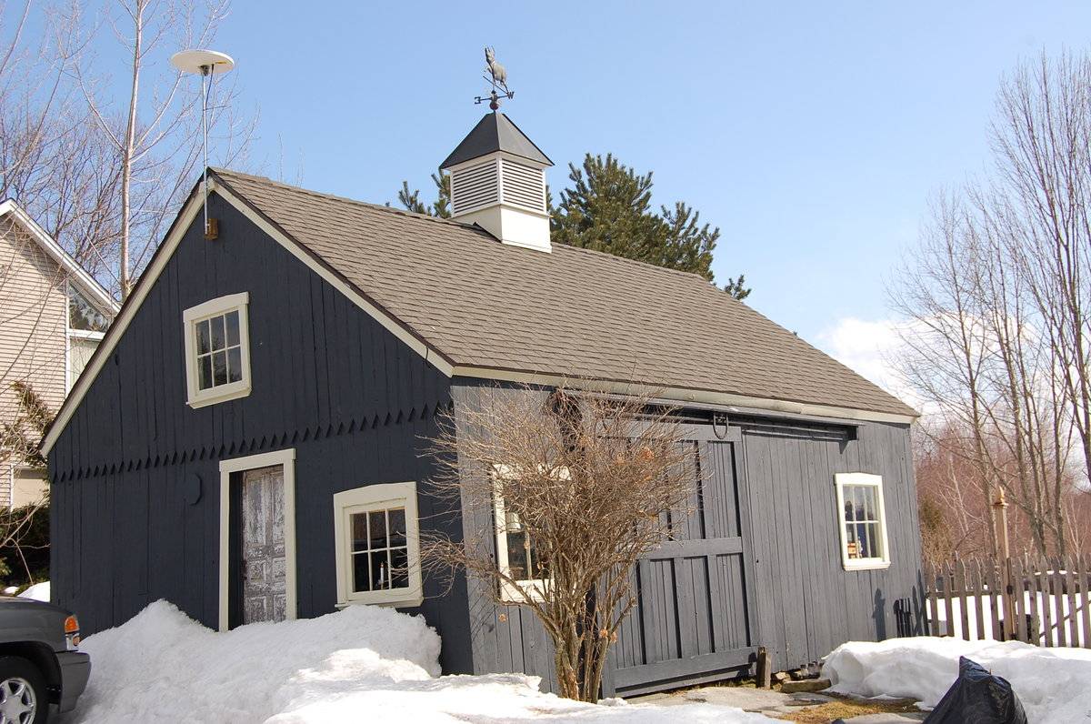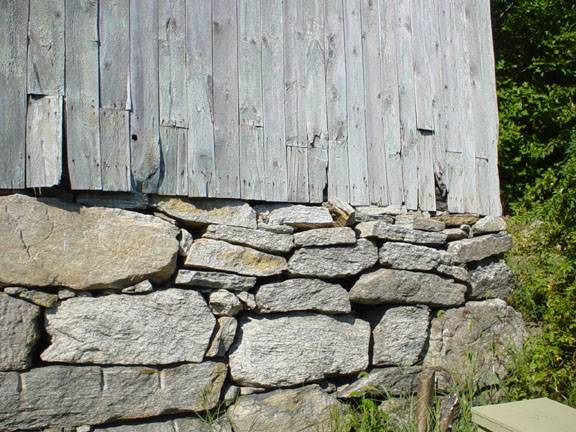 The wooden frame of the barn is supported on coursed field stone masonry foundation which appears to be un-mortared. The barn has light grey painted vertical siding and asphalt shingle roofing.