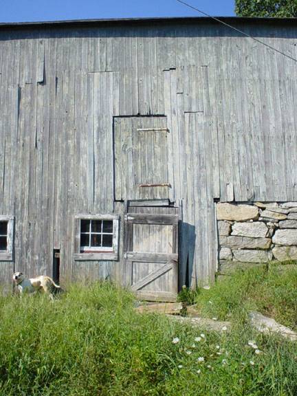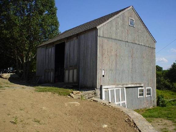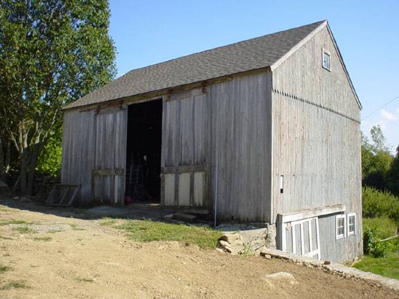 Barn-I: This is 1 1/2 –story three-bay eave-entry barn with a bank along its west gable-end and the south eave-side. The west gable-end of the barn faces Barn Hill Road with the ridge line running east-west perpendicular to the road. The three-bay north eave-side of the barn is the main façade with the main entrance centered in the middle bay through a pair of double-height exterior-hung sliding wagon doors. The grade level along the façade drops towards the southwest to form the barn along the west gable-end of the barn with the lose earth retained by coursed field stone masonry. The bank level of the west gable-end has an entrance towards the north through an exterior-hung hooded sliding wagon door and two framed six-pane windows closely spaced towards the south. The gable attic is separated by a distinct dropped girt siding divide line finished off in saw-tooth detail and has a four-pane window at the center. The low grade level wraps the barn along its south eave-side to form the bank level which has an entrance at the center through a Z-braced hinged pass-through door. Two six-pane windows with frame can be seen towards the west of the pass-through door while the ban level has exposed coursed filed stone masonry towards the east. The first floor level of the south eave-side of the barn has a hinged bay door at the center with blacksmith hardware.