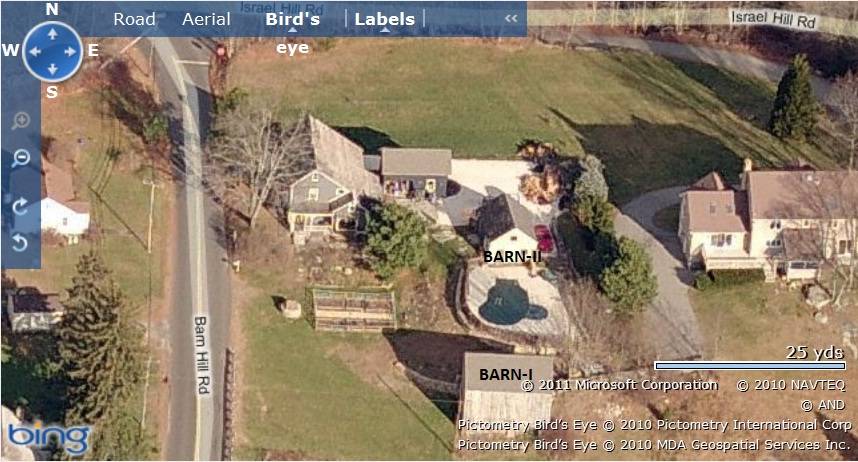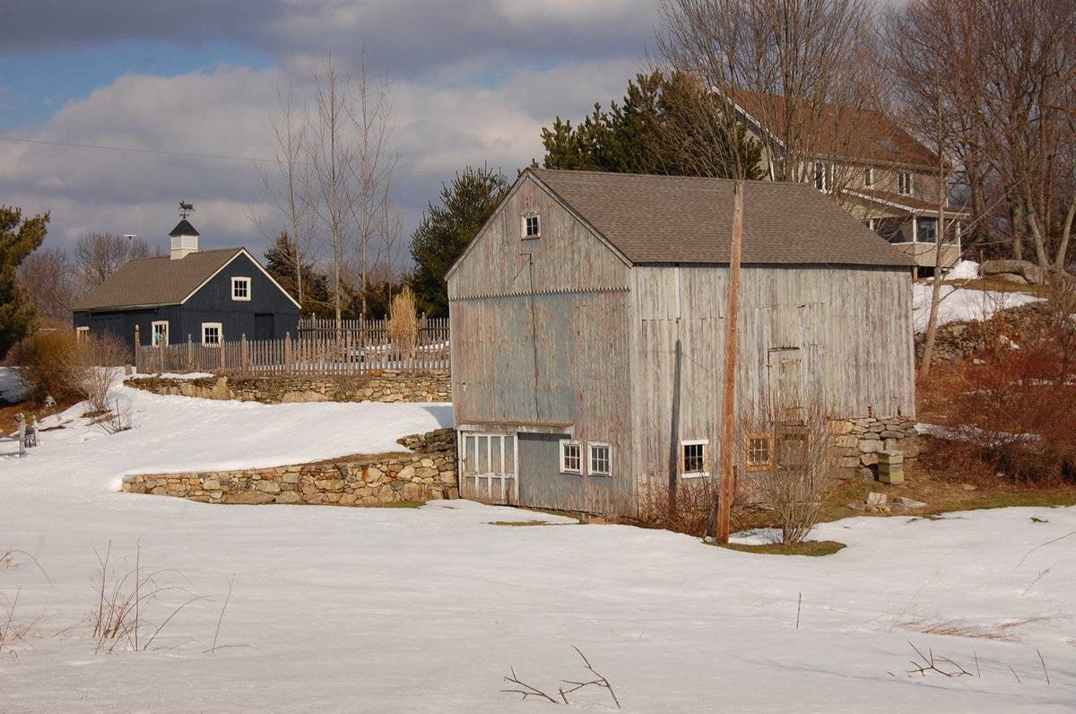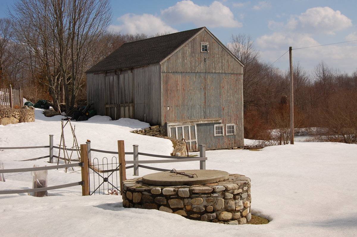 The two barns are located along the eastern edge of the plot with Barn-I towards the south and Barn-II towards the north. The ridge line of Barn-I runs east-west perpendicular to Barn Hill Road while that of Barn-II runs north-south. The circa 1900 colonial main residence is located towards the northwest of Barn-II while a swimming pool located towards its south. Another 1 ½- story eave-entry shed can be seen towards the east of the main residence with its ridge line running east-west. The property has open land along its northern edge. A mortared field stone masonry well is located towards the northwest of Barn-I while field stone retaining wall can be seen towards its north.