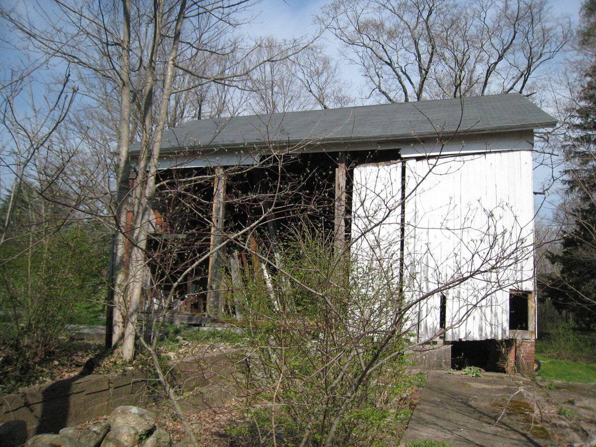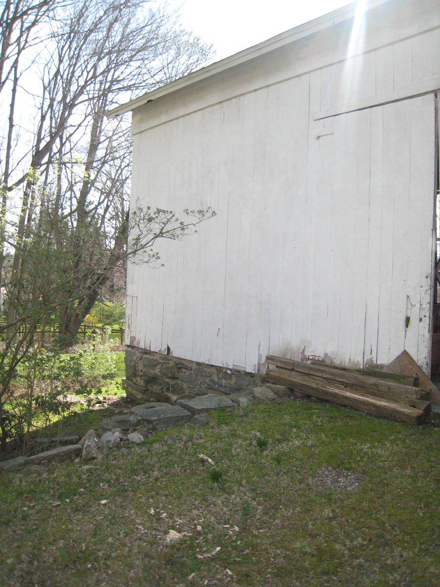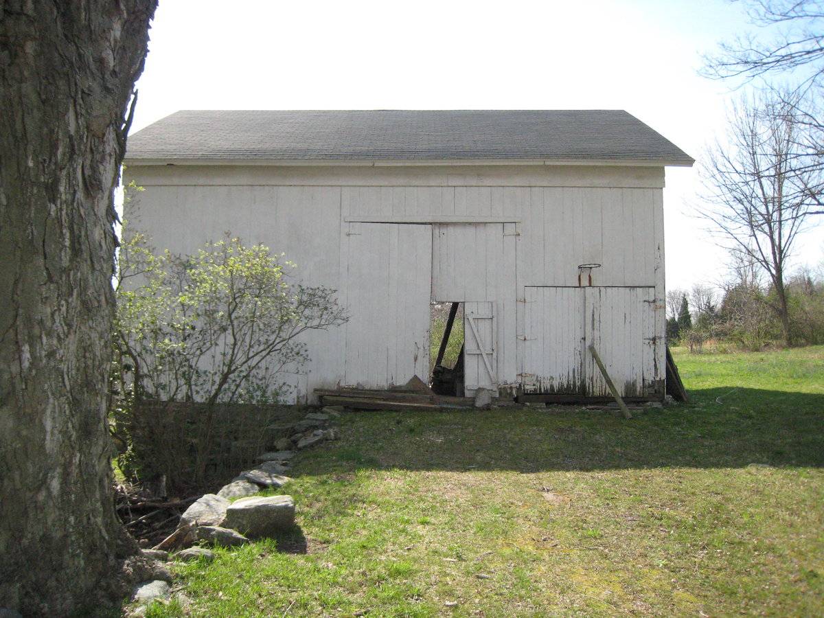 This is a 1 ½ story three-bay, side- or eave-entry bank barn with the main eave-facade facing north and the ridge line running north-south. The main entry, on the north eave-facade, is a pair of tall hinged doors in the center bay. There is a weather door in the western-most, or right, hinged door. The west bay on the north eave-facade has a smaller pair of hinged doors. The east bay appears blank. The main floor of the east gable-facade is blank and the basement level is open and supported on brick pillars. The east and center bays on the south eave-facade are missing their sheathing. The west bay is blank. In the south corner of the west gable-facade has an opening where the sheathing has been removed from the basement level. Centered in the attic gable of the west gable-facade is a four-over-four fanlight. The barn has vertical siding that is painted white with remnants of the original un-mortared fieldstone foundation and newly built brick piers. The roof has asphalt shingles with a deep overhang and frieze on all four facades.