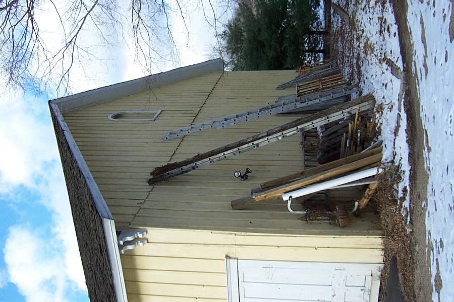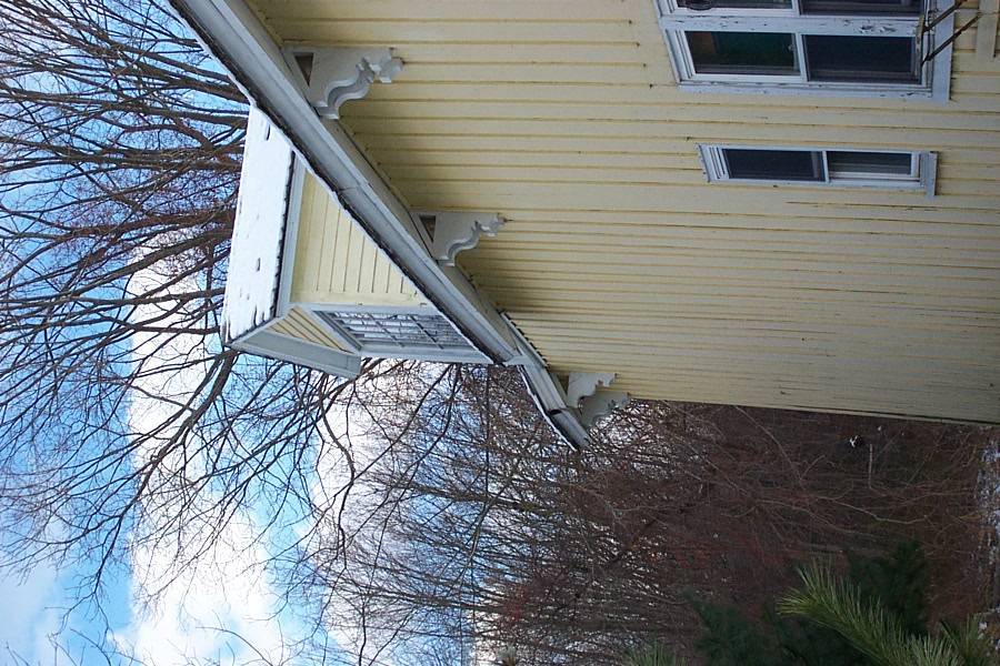The north eave-facade has three replacement windows; two adjacent to each other and a third to the east. All three windows are in the western half of the north eave-facade. The eastern half of the facade is blank except for a window dormer with a twenty-pane window. There are three pairs brackets at regular intervals in the western half of the facade and two pairs of brackets east of the dormer.