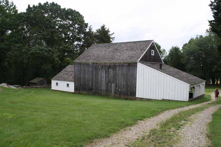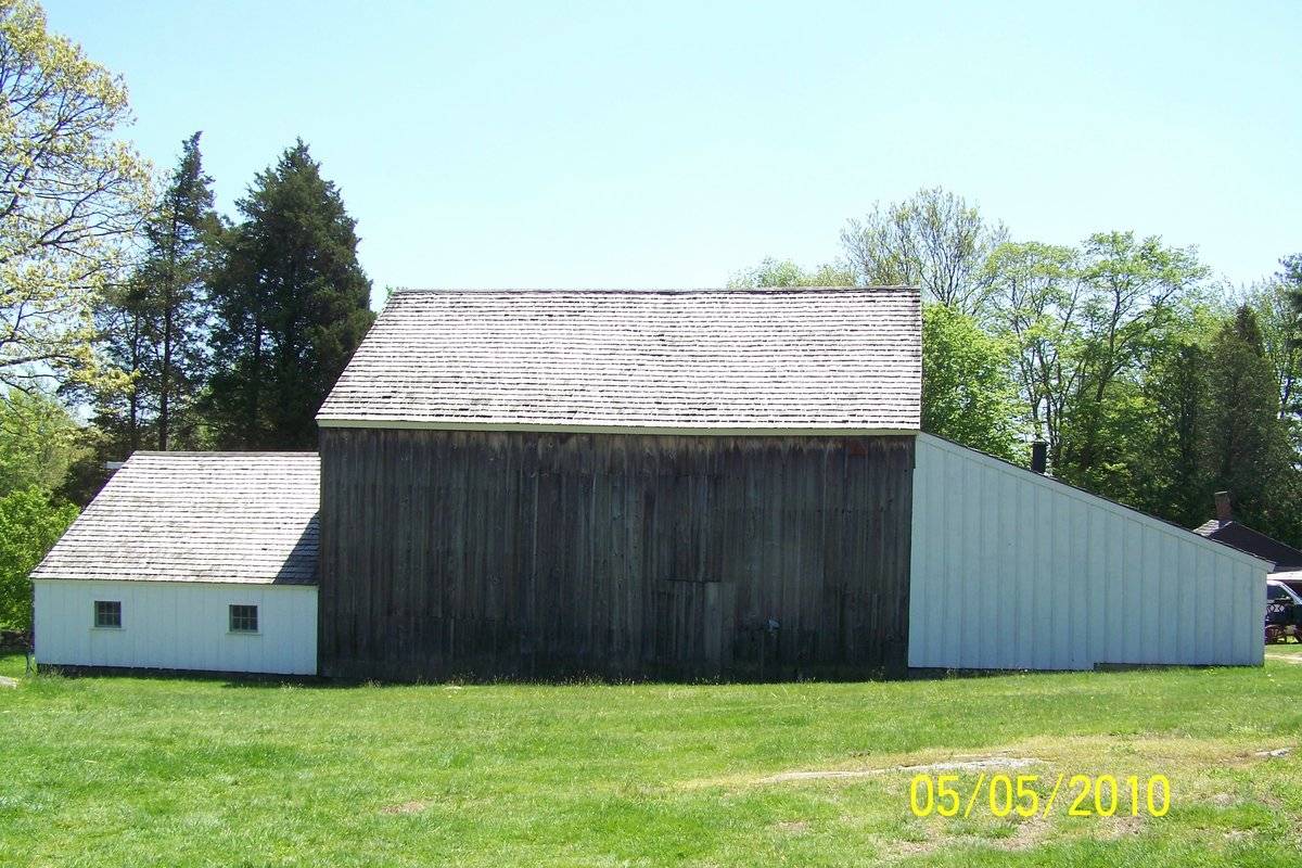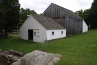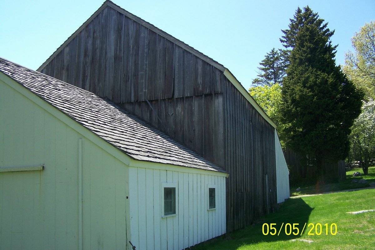 This is a 1 1/2 story tripartite side or eave-entry barn with a shed-roofed addition and a gable-roofed addition. The main facade faces south towards Boston Post Road, which runs approximately east-west. The main entry in the middle bay is a pair of swinging hinged doors with black-smithed hardware and a thick-framed, twelve-pane window inserted in each. The eastern bay has a similar window and a a pass-through door with black-smithed hardware. The western bay has a pass-through door with black-smithed hardware. Flush with the southern facade is the side of the shed-roofed addition, which extends to the west from the west gable-facade. The addition has two pairs of swinging hinged doors on the south side. The west side of the addition has three boarded openings that match the south side openings in appearnace. It encompasses the entire facade except for the gable attic, which has a six-pane, thick-framed window. The north eave-facade is blank except a pass-thrpigh door. Encompassing the west gable-facade of the barn is a gable-roofed addition, also painted white. The barn has board-and-batten unpainted siding and a wood shingle roof. The gable-roofed addition has board-and-batten siding painted white and a wood shingle roof. The shed-roofed addition has board-and-batten siding on the north side and flush-board siding on the south side, painted white as well as a wood shingle roof. The additions have mortared field-stone foundations.