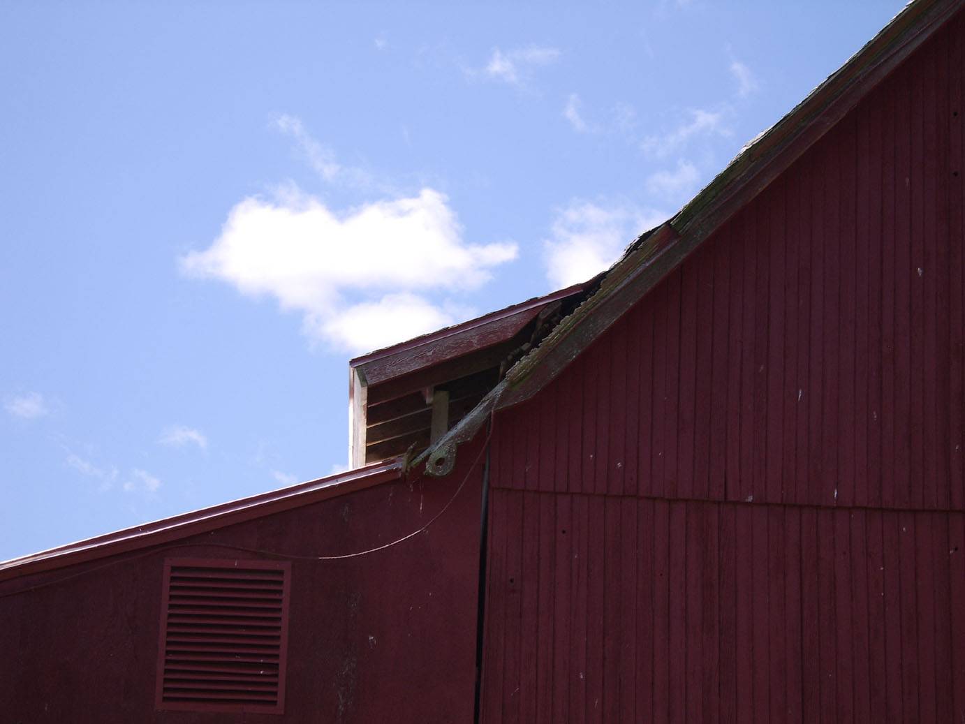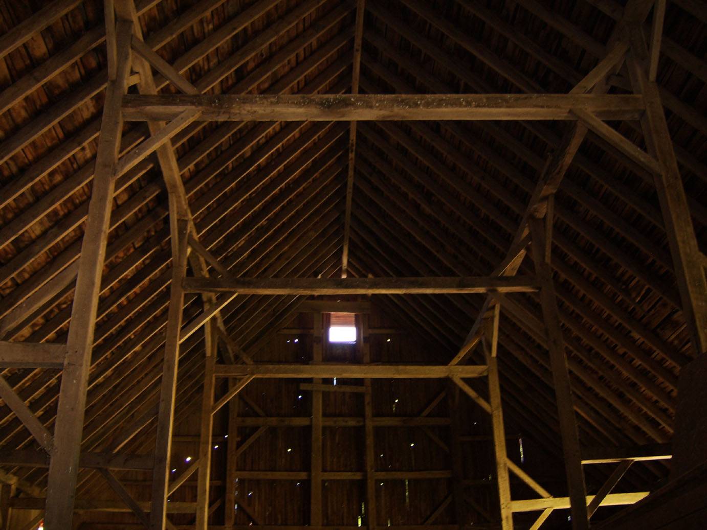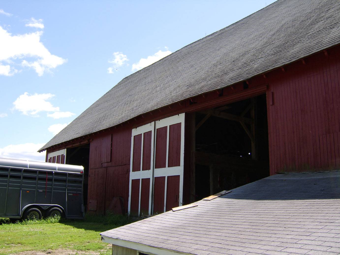 The oldest barns still found in the state are called the “English Barn,” “side-entry barn,” “eave entry,” or a 30 x 40. They are simple buildings with rectangular plan, pitched gable roof, and a door or doors located on one or both of the eave sides of the building based on the grain warehouses of the English colonists’ homeland. The name “30 by 40” originates from its size (in feet), which was large enough for 1 family and could service about 100 acres. The multi-purpose use of the English barn is reflected by the building’s construction in three distinct bays - one for each use. The middle bay was used for threshing, which is separating the seed from the stalk in wheat and oat by beating the stalks with a flail. The flanking bays would be for animals and hay storage. In this case, it appears as if two three-bays barns were joined together.