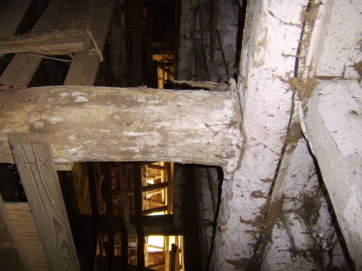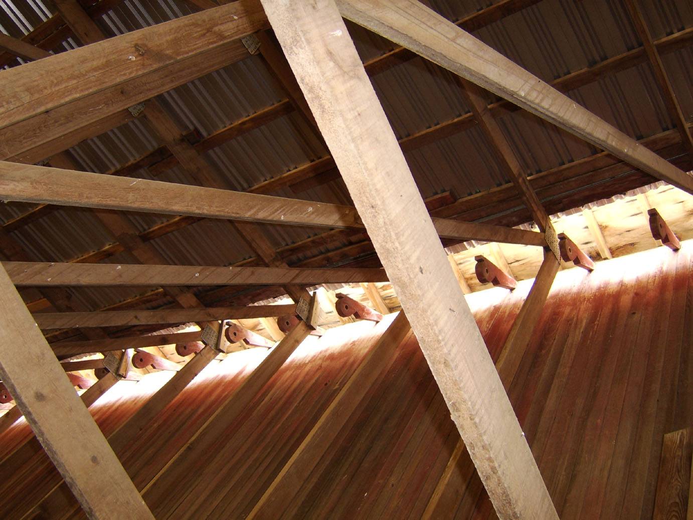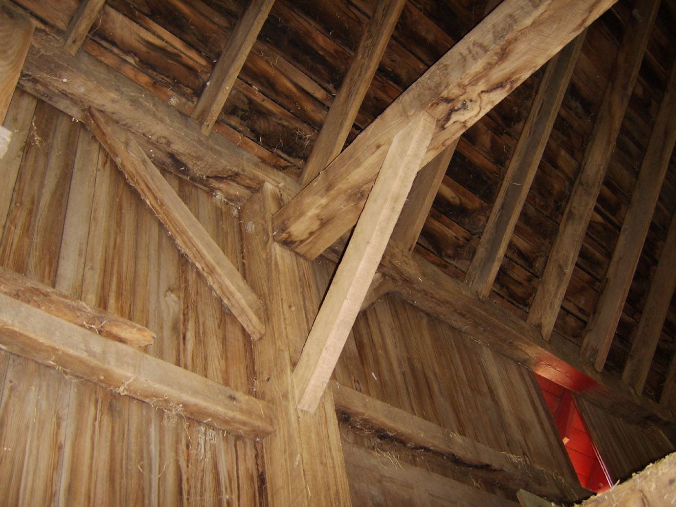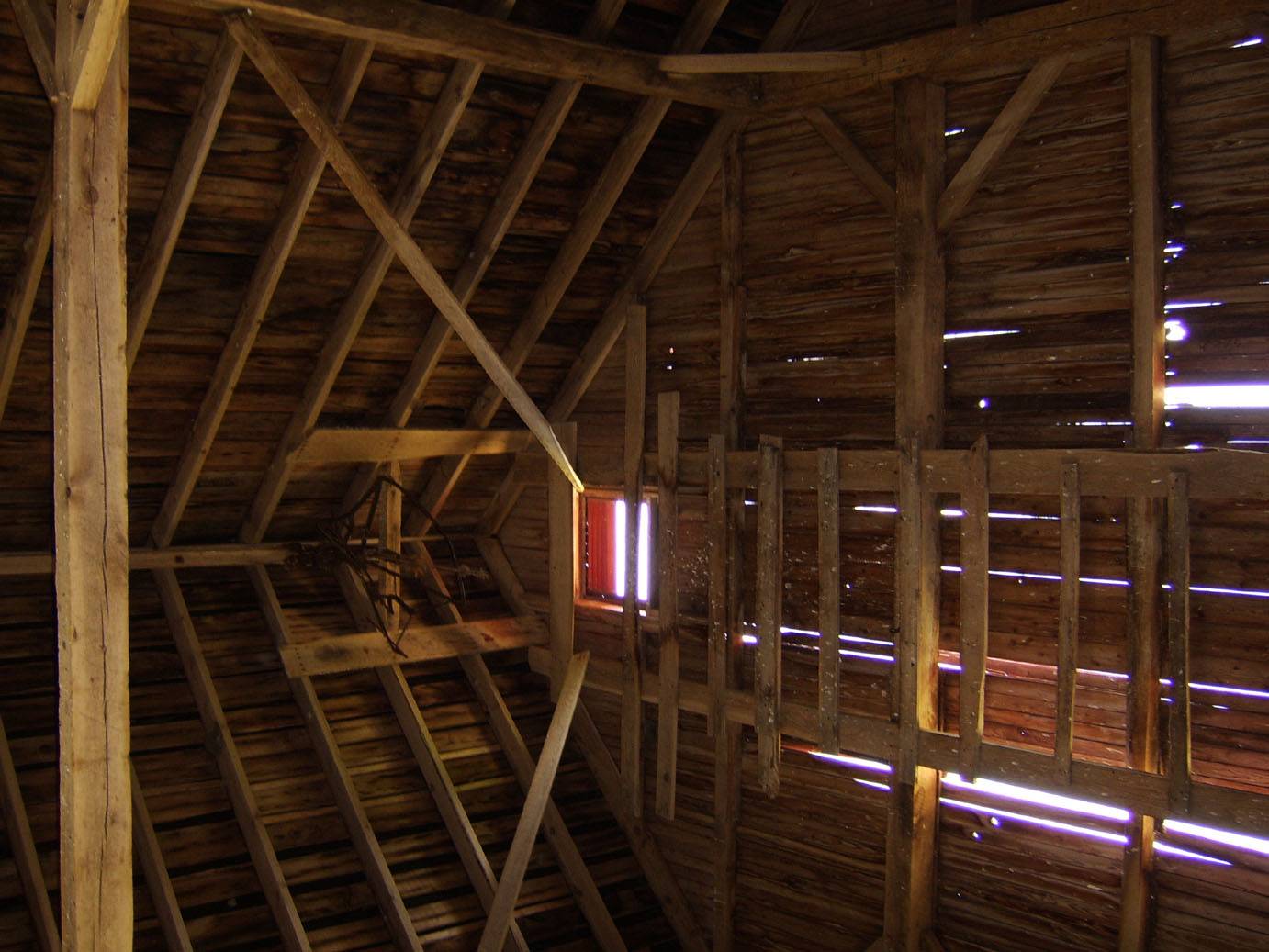 The oldest barns still found in the state are called the “English Barn,” “side-entry barn,” “eave entry,” or a 30 x 40. They are simple buildings with rectangular plan, pitched gable roof, and a door or doors located on one or both of the eave sides of the building based on the grain warehouses of the English colonists’ homeland. The name “30 by 40” originates from its size (in feet), which was large enough for 1 family and could service about 100 acres. The multi-purpose use of the English barn is reflected by the building’s construction in three distinct bays - one for each use. The middle bay was used for threshing, which is separating the seed from the stalk in wheat and oat by beating the stalks with a flail. The flanking bays would be for animals and hay storage. In this case, it appears as if two three-bays barns were joined together.